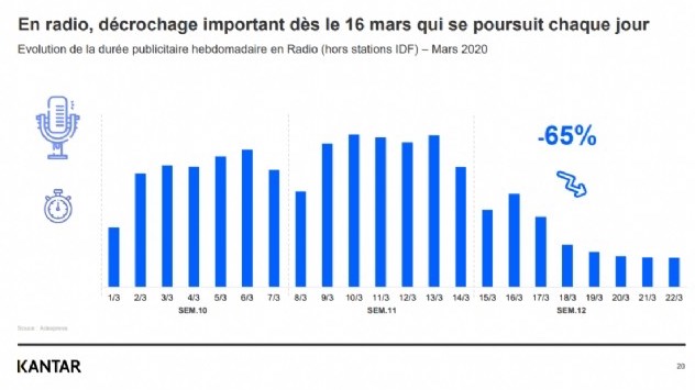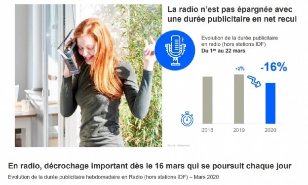 C'est le paradoxe de la crise du Coronavirus : malgré une forte hausse de la consommation des médias, le marché publicitaire ressent déjà les effets négatifs, selon l'étude Covid-19 Monitor de Kantar portant sur la période du 1er au 22 mars. Si la TV voit sa durée publicitaire chuter de 35 % sur cette période par rapport à l'an passé, celle de la radio a baissé de 16% entre le 1er et le 22 mars 2020 par rapport à la même période l’an passé, avec un décrochage enregistré le 16 mars, date du début du confinement. Dans le même temps, le média a perdu 35% de ses annonceurs. Le secteur de la distribution, qui représente une part importante en radio, s’est fortement désengagé (-54%).