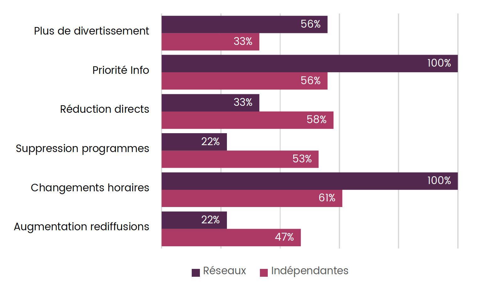 Une importante majorité des éditeurs a adapté ses programmes pour faire face à la crise ou pour répondre aux besoins des auditeurs : c’est le cas pour 2/3 des radios en réseau et 78% des radios indépendantes qui ont participé à l’enquête. L’arrêt de la vie culturelle a entraîné la suspension des agendas et des émissions de promotion culturelle ; les rendez-vous d’information et autres émissions spéciales sur la crise se sont multipliés ou encore les animateurs sont devenus des ambassadeurs des consignes de sécurité en donnant l’exemple et les émissions ont été produites à distance.