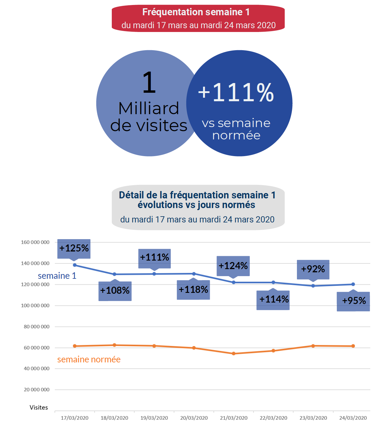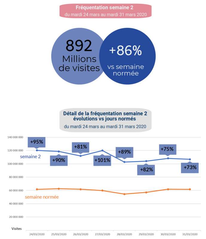 Actuellement dans la troisième semaine de confinement, on note que les deux premières semaines sont restées, après le pic du 15 et 16 mars, à des niveaux exceptionnels de fréquentation, le nombre de visites enregistrées chaque jour se situant au double d’un jour moyen, sur la centaine de supports étudiés. L'étude a été menée sur les sites (fixes, mobiles et AMP) et applications (mobiles et
