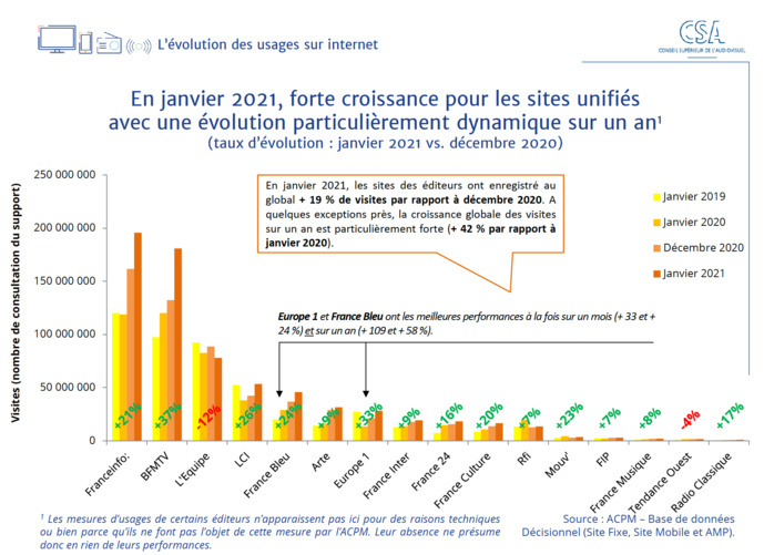 En ce début d’année 2021, on note, concernant les usages internet, une pérennisation des progressions déjà observées en 2020 chez les éditeurs mesurés sur leurs sites et sur leurs applications, sur un an comme par rapport à décembre 2020...