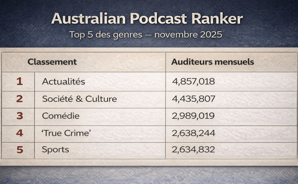 Les résultats de novembre 2025 de l’Australian Podcast Ranker confirment le poids structurant de l’actualité et des contenus parlés dans les usages audio en Australie. Publié par Commercial Radio & Audio et Triton Digital, ce baromètre de référence met en lumière les genres et podcasts les plus écoutés,