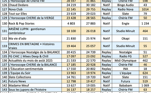 En août 2025, l’ACPM enregistre une hausse de 5% du volume total de téléchargements sur les 762 podcasts mesurés, comparé à août 2024. "HugoDécrypte" conserve sa première place avec "Les Actus du jour", tandis que NRJ Global domine le classement des groupes avec plus de 5.7 millions de téléchargements monde.