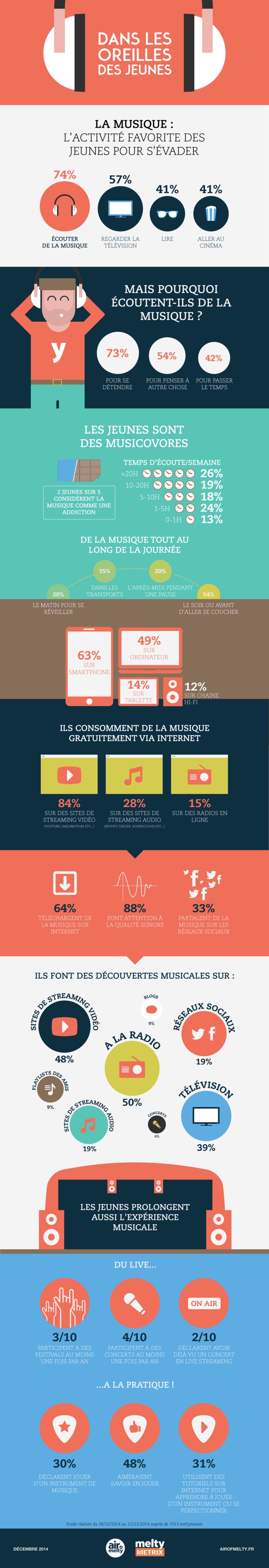 Dénommée "Dans les oreilles des jeunes", cette étude démontre d'abord que l'activité favorite des jeunes est d'écouter de la musique. C'est le cas pour 74% d'entre eux. Des jeunes qui écoutent avant tout de la musique pour se détendre, pour penser à autre chose et pour passer le temps. Les jeunes aiment d'ailleurs tellement la musique que 2 sur 5 considèrent celle-ci comme une "addiction" !
