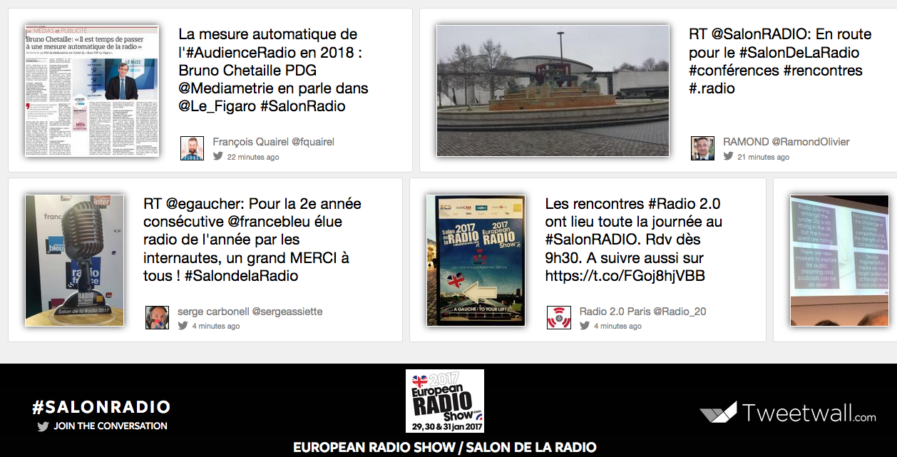 Sur Twitter, plusieurs comptes vous permettent aussi de suivre le Salon de la Radio : le compte @SalonRADIO (en français) et le compte @EuropeanRadioShow (en anglais). Enfin, sur la HomePage du site de La Lettre Pro de la Radio, vous retrouvez l'ensemble des tweets envoyés avec le hashtag #SalonRadio.