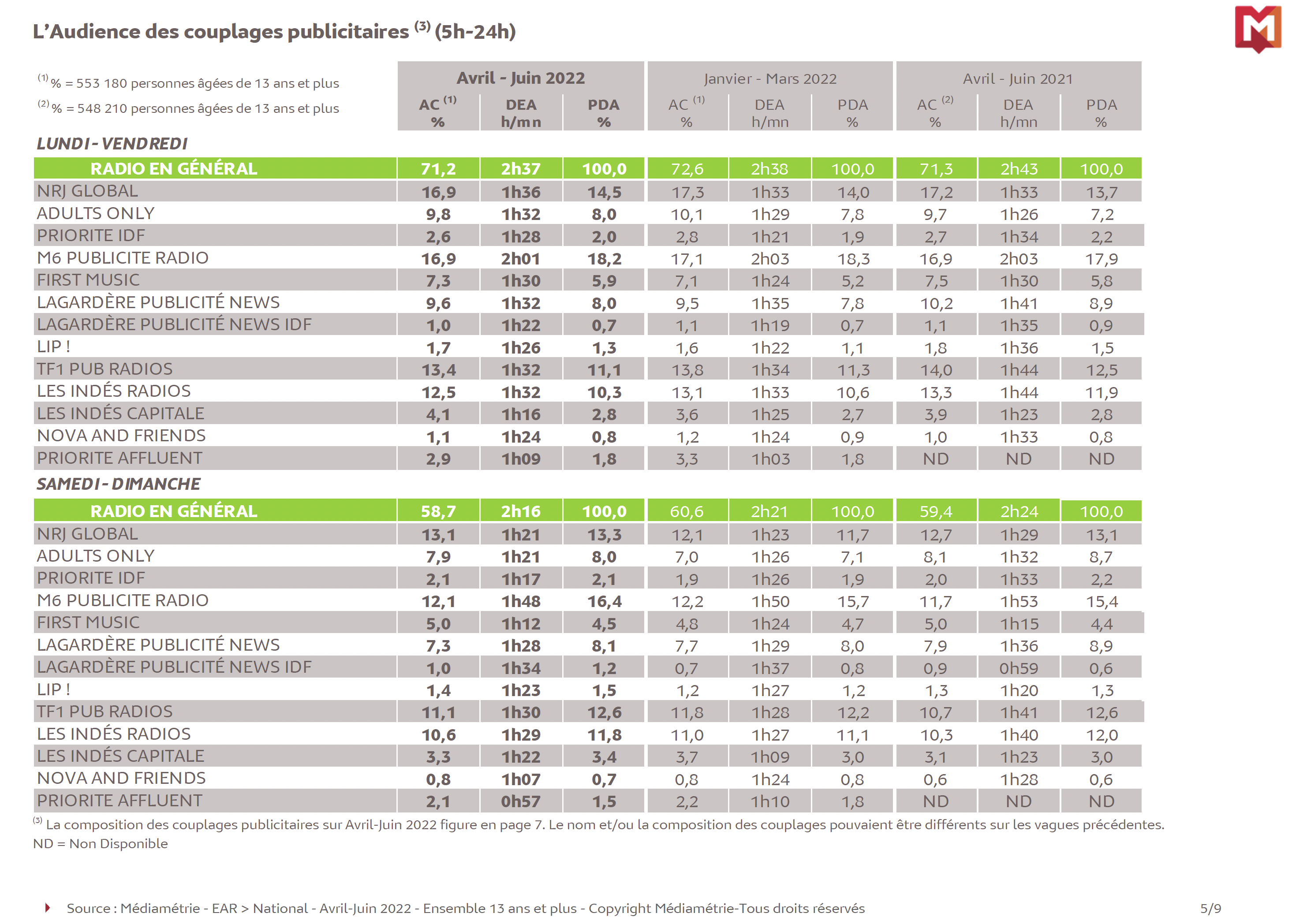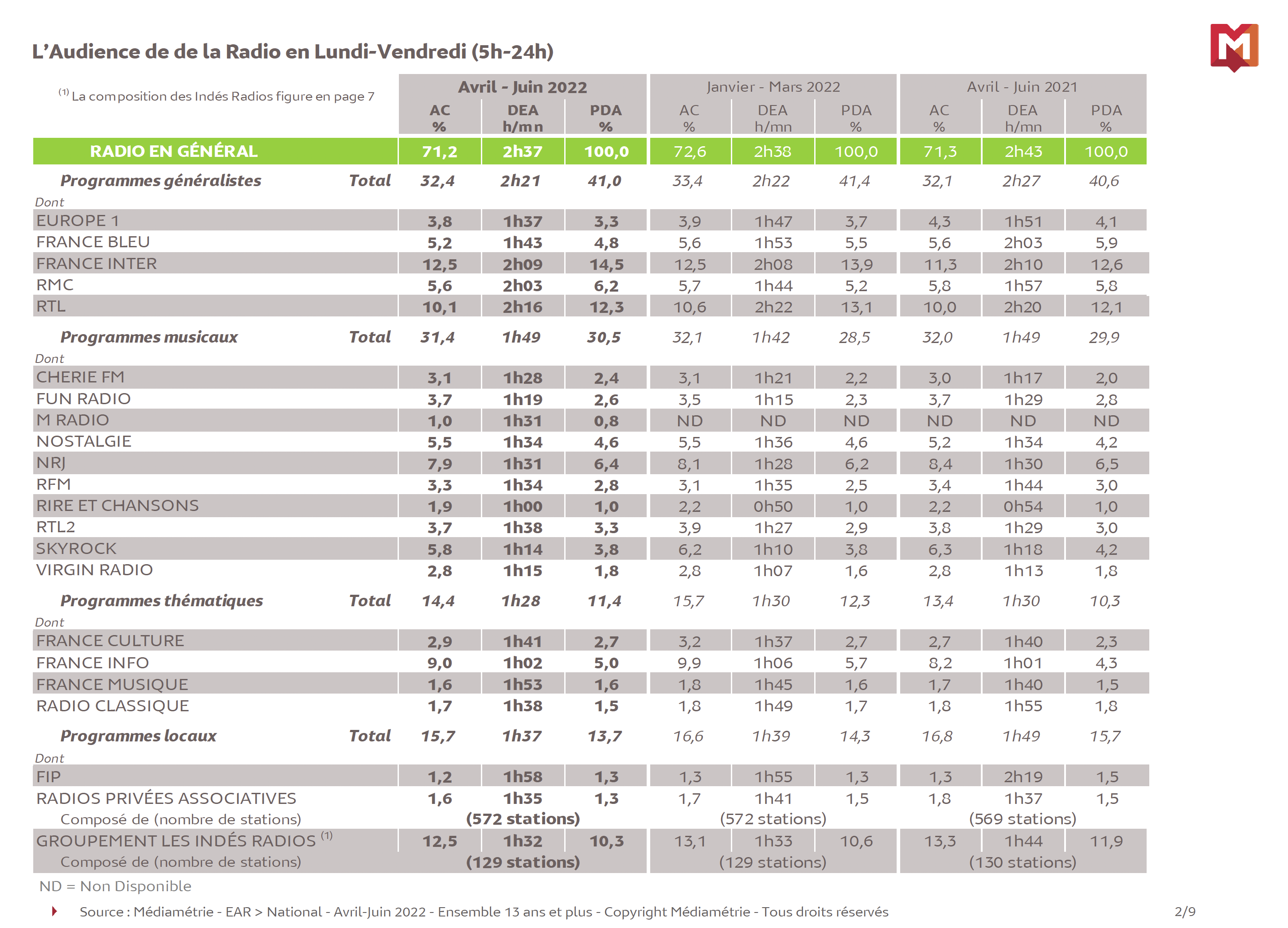 Rappelons que l'EAR (Étude Audience Radio) est une enquête permanente qui repose sur 100 000 interviews réalisées auprès de la population âgée de 13 ans et plus, réparties sur 10 mois de septembre à juin, dimanches et jours fériés compris. L'enquête est réalisée depuis les terrains d'enquête de Médiamétrie basés à Amiens et à Petit Quevilly (dans l'agglomération rouennaise) via des interviews téléphoniques assistées par ordinateur (système CATI). Les résultats de l'enquête EAR sont publiés 4 fois par an : la période septembre/octobre (sortie mi-novembre), la période novembre/décembre (sortie mi-janvier), la période janvier/mars (sortie mi-avril) et la période avril/juin (sortie mi-juillet).