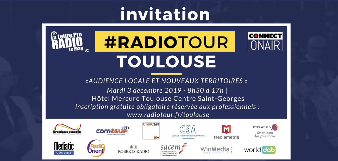C'est la fin d'un Tour de France radiophonique avant la grand-messe du Salon de la Radio et de l'Audio Digital qui se déroulera à la Grande Halle de la Villette à Paris, du 23 au 25 janvier. Toulouse est donc la dernière étape du RadioTour. Tous les opérateurs et les professionnels de la radio sont conviés à l'Hôtel Mercure Toulouse Centre Saint-Georges, mardi prochain, le 3 décembre. Une nouvelle fois, nous proposerons des conférences gratuites et de rencontres avec vous pour comprendre, découvrir et trouver des solutions concrètes répondant aux enjeux de la radio d'aujourd'hui et de demain. Les débats seront ouverts par François-Xavier Meslon, directeur des médias radios au Conseil supérieur de l'audiovisuel.