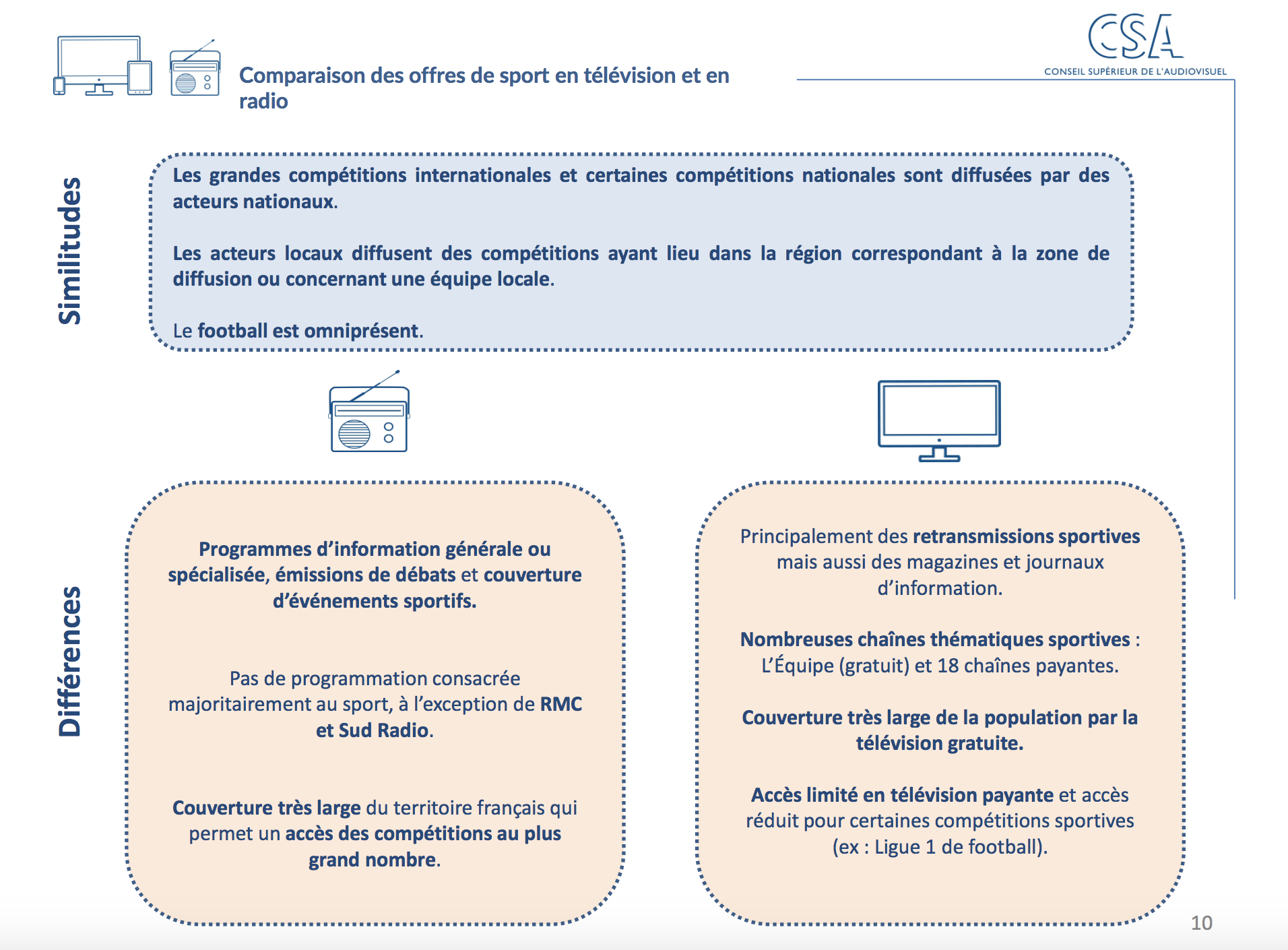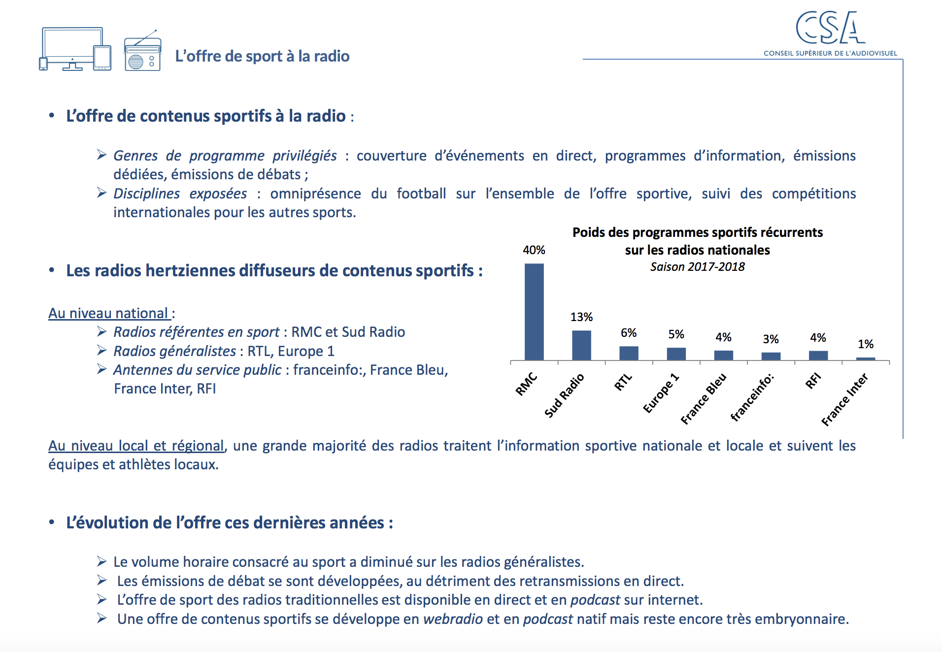 Le cadre juridique français permet à tout service de radio de diffuser gratuitement toute manifestation sportive se disputant sur le territoire (art. L. 333-7 du code du sport). Les radios n’ont donc pas à payer de droits pour diffuser des compétitions qui ont lieu en France. D’un point de vue général et en sport en particulier, les annonceurs investissent modérément en radio contrairement à la télévision. A titre indicatif, les recettes publicitaires nettes de la télévision sont estimées en 2018 à 3.430 Mds €, contre 701 M € pour la radio. Un programme sportif n’est pas plus valorisé que d’autres programmes en radio, alors que c’est le cas en télévision. C’est en particulier le cas quand les compétitions sportives ont lieu à des heures de faible écoute en radio qui correspondent au pic d’audience pour la télévision (fin d’après-midi et soirée).