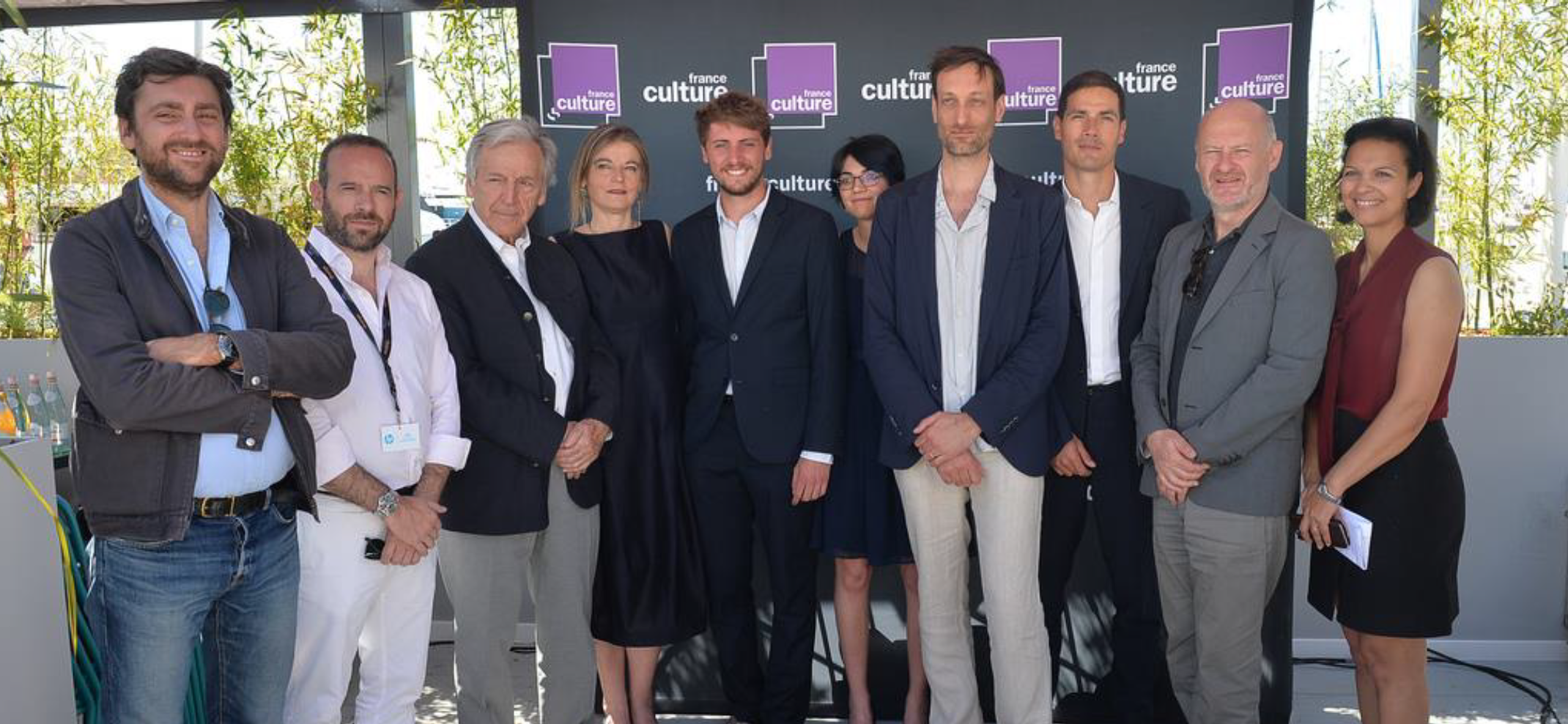 La remise du Prix France Culture cinéma en 2017 avec Sebastien Laudenbach et deux étudiants représentant des jurés du Prix France Culture Cinéma des étudiants, Costa Gavras (Prix France Culture Consécration), Éric Juherian, producteur de "The new kid "de Rudi Rosenberg (International student award), Sandrine Treiner, directrice de France Culture, Mathieu Gallet, alors PDG de Radio France, Isabelle Giordano et Jean Paul Salomé