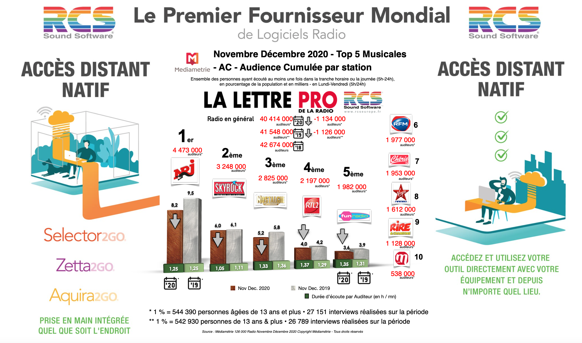 Médiamétrie vient de publier les résultats de son enquête 126 000 Radio portant sur la période Novembre-Décembre 2020. La Lettre Pro de la Radio vous propose ses diagrammes exclusifs pour comprendre toutes les audiences et leurs incidences.Fondateur et directeur de la publication de La Lettre Pro de la Radio et du Podcast et de Podcast... En savoir plus sur cet auteur