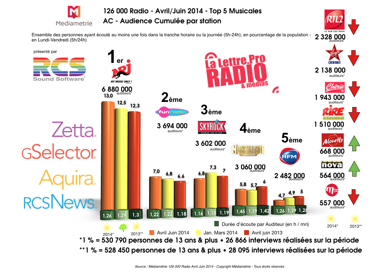 Diagramme exclusif LLP/RCS GSelector 4 - TOP 5 radios Musicales en Lundi-Vendredi - 126 000 Radio Avril-Juin 2014