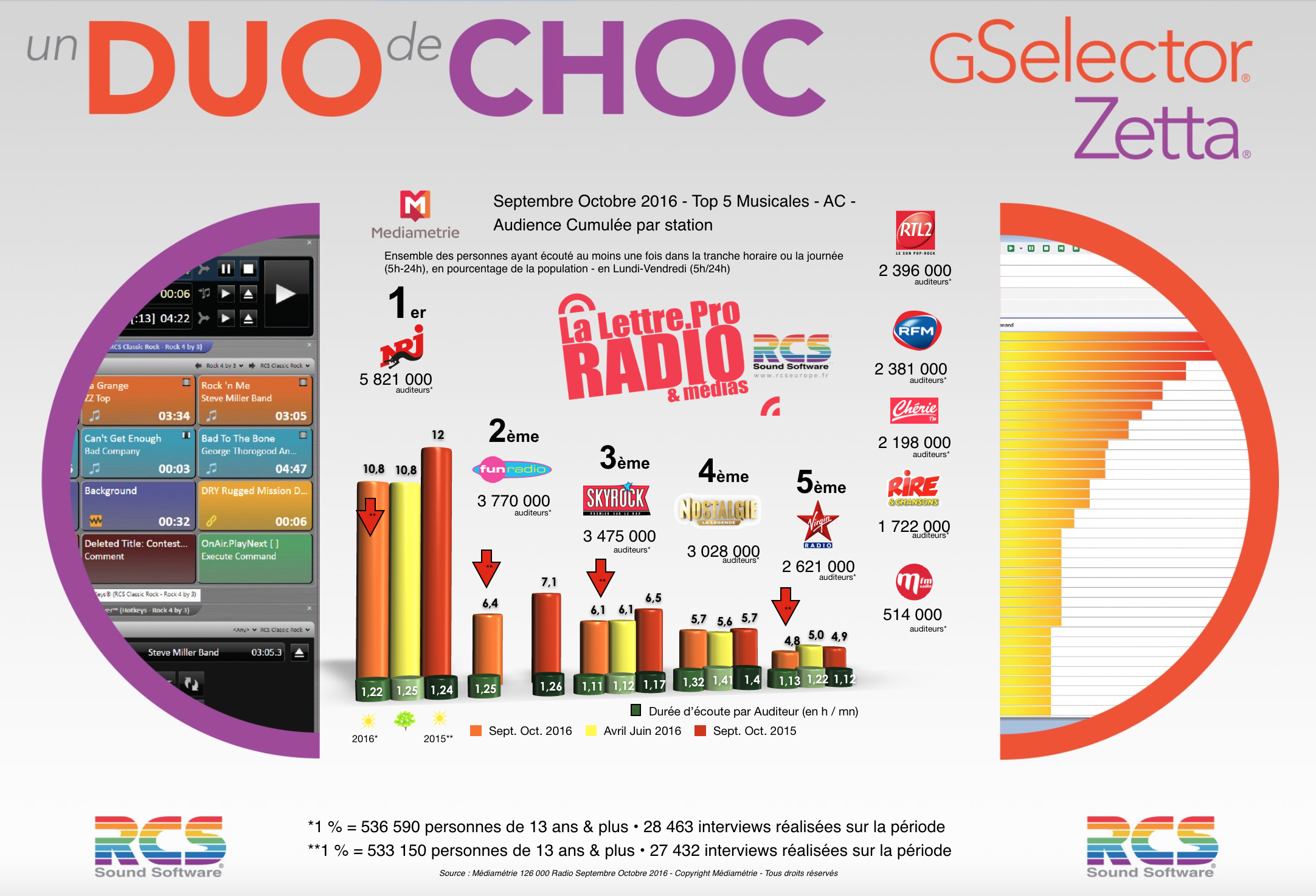 Diagramme exclusif LLP/RCS GSelector 4 - TOP 5 radios Musicales en Lundi-Vendredi - 126 000 Septembre-Octobre 2016