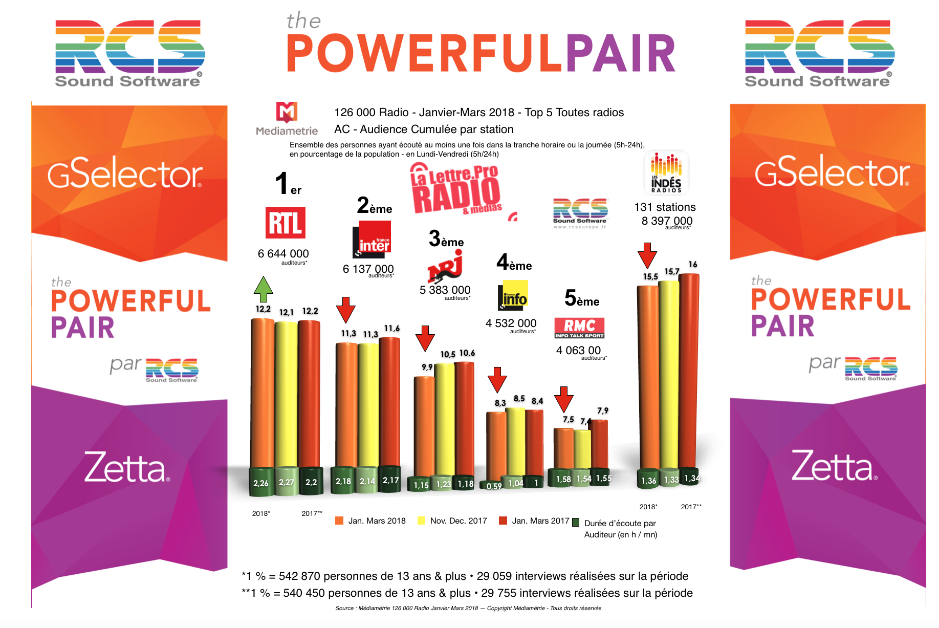 Diagramme exclusif LLP/RCS GSelector Zetta - TOP 5 toutes radios confondues en Lundi-Vendredi - 126 000 Radio Janvier-Mars 2018