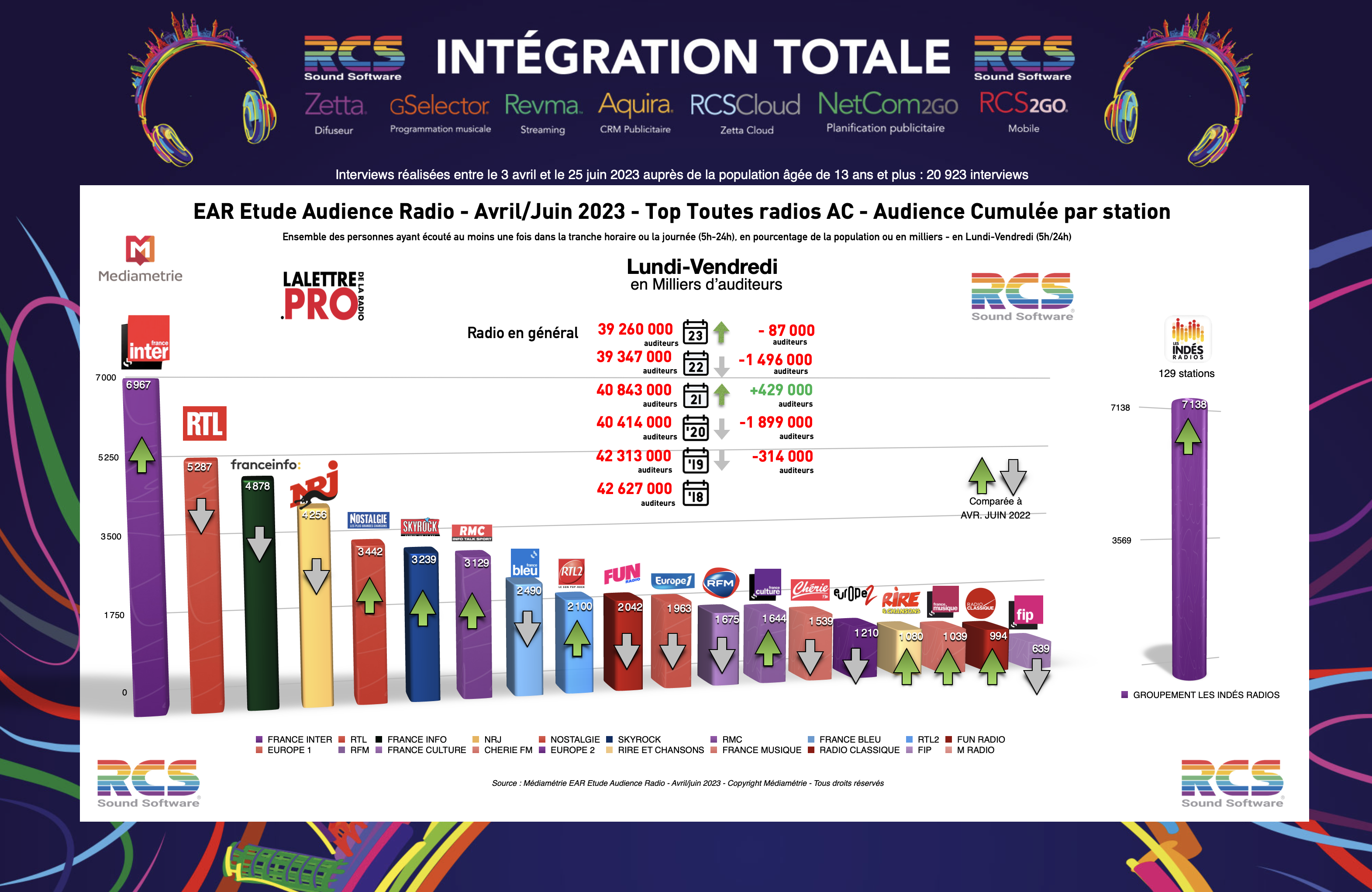 Médiamétrie vient de publier les résultats de son enquête Etude Audience Radio portant sur la période avril-juin 2023. La Lettre Pro de la Radio vous propose ses diagrammes exclusifs pour comprendre toutes les audiences et leurs incidences.