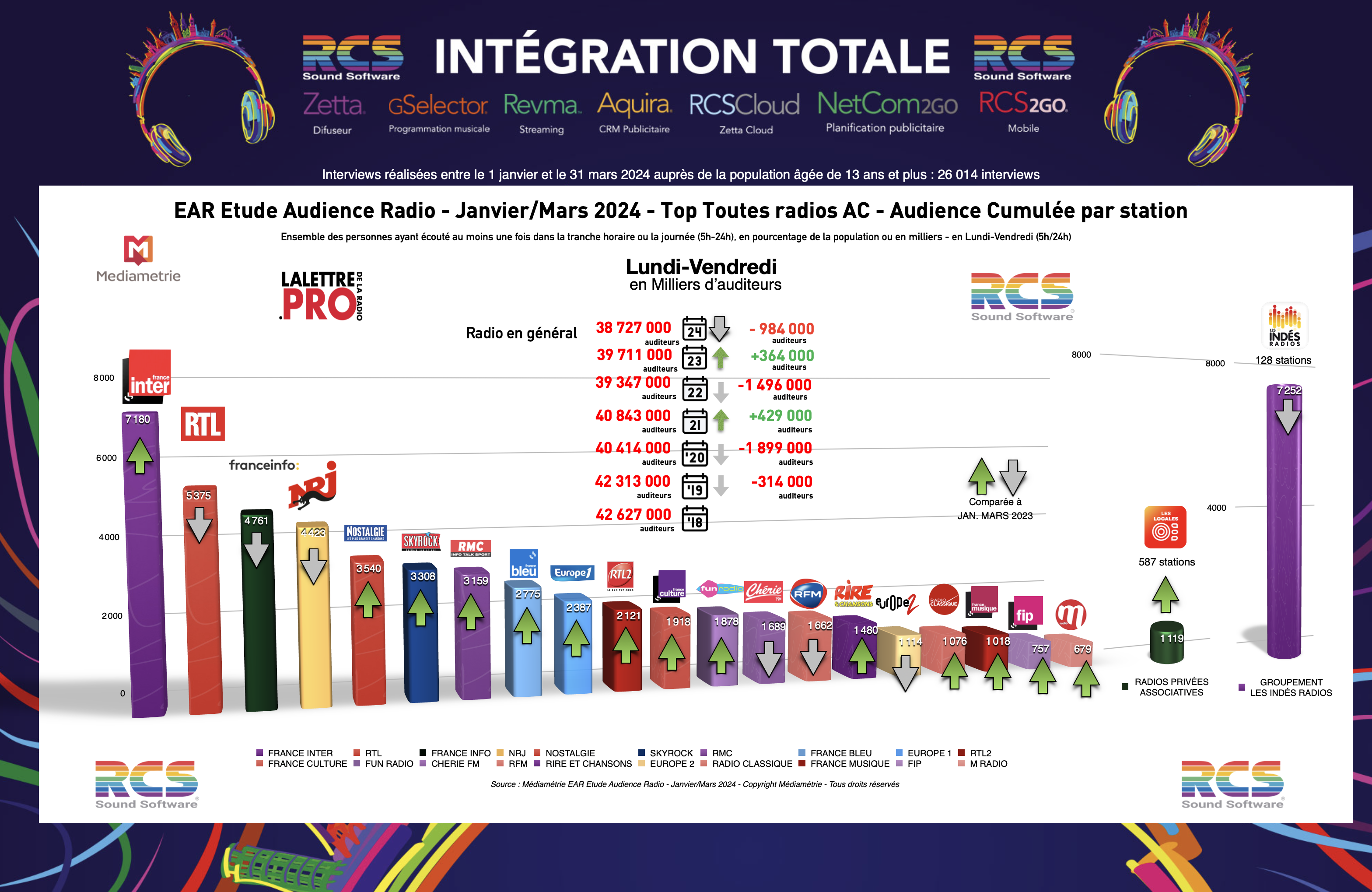 Médiamétrie vient de publier les résultats de son enquête Etude Audience Radio portant sur la période janvier-mars 2024. La Lettre Pro de la Radio vous propose ses diagrammes exclusifs pour comprendre toutes les audiences et leurs incidences.Fondateur et directeur de la publication de La Lettre Pro de la Radio et du Podcast et de Podcast... En savoir plus sur cet auteur