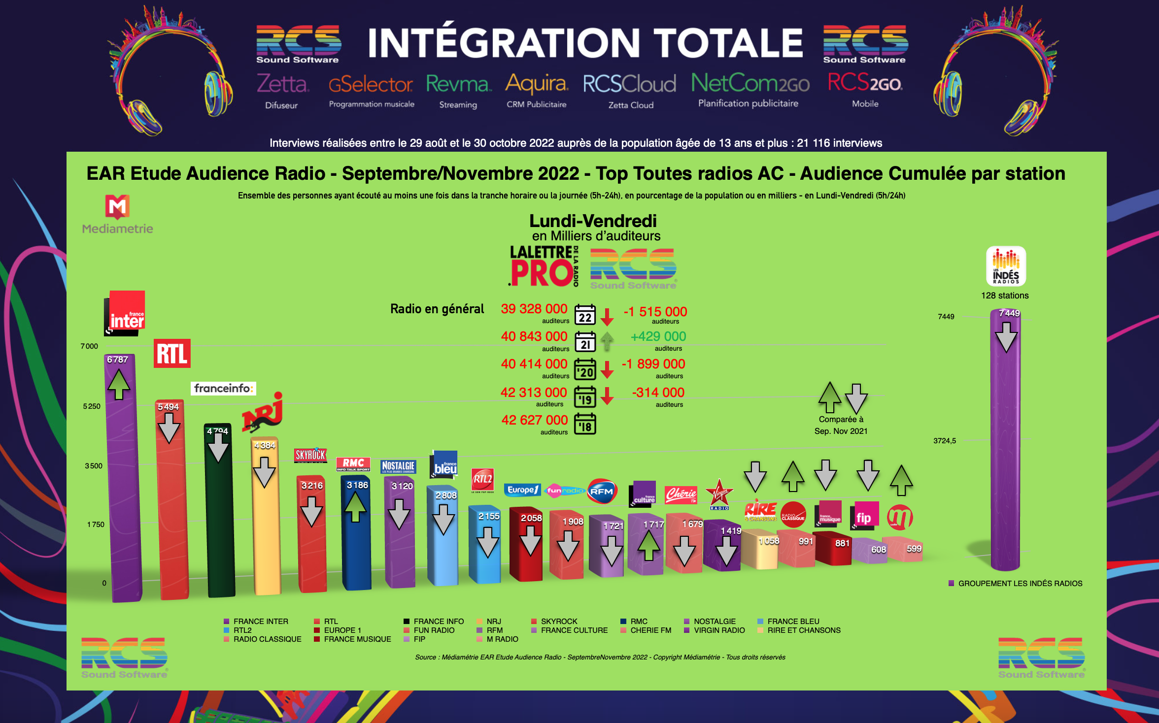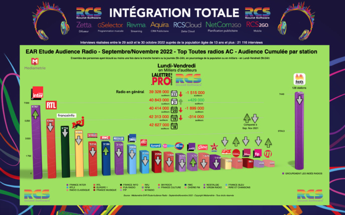 Médiamétrie vient de publier les résultats de son enquête Etude Audience Radio portant sur la période septembre-novembre 2022. La Lettre Pro de la Radio vous propose ses diagrammes exclusifs pour comprendre toutes les audiences et leurs incidences.Fondateur et directeur de la publication de La Lettre Pro de la Radio et du Podcast et de Podcast... En savoir plus sur cet auteur