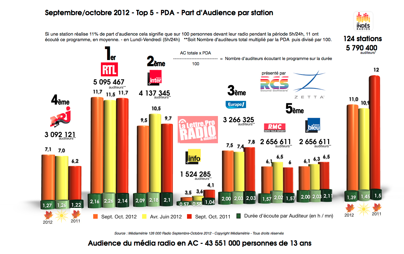 Septembre/octobre 2012 - Top 5 - PDA - Part d’Audience par stationBrulhatour est le rédacteur en chef du magazine La Lettre Pro de la Radio et le directeur associé... En savoir plus sur cet auteur