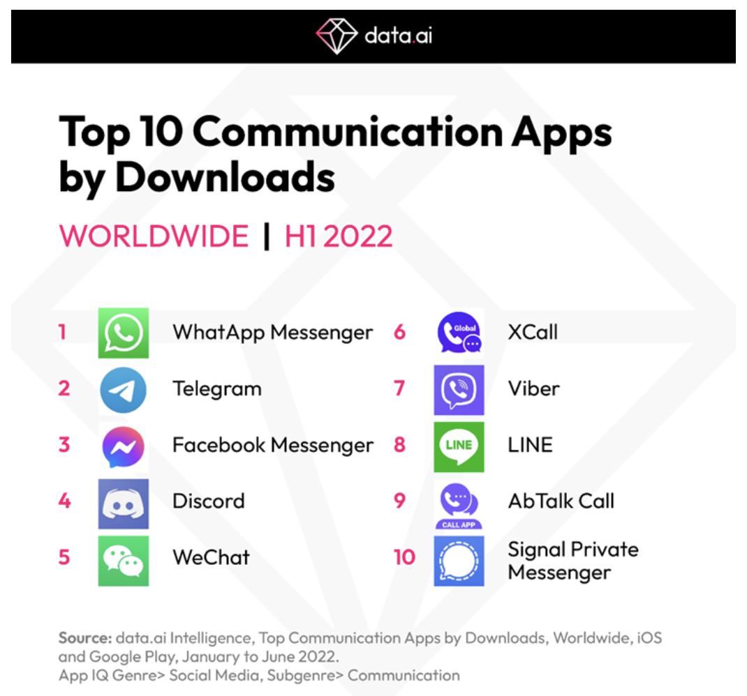 La pandémie mondiale a accéléré la croissance des applications de communication au sens large, telles que Zoom (qui a récemment dépassé le milliard de téléchargements dans le monde) et Microsoft Teams, en tant qu'outils essentiels pour les activités quotidiennes, le travail et les loisirs. Leur succès soutenu après la pandémie indique que les plateformes de communication facilitant la communication vidéo et audio à une plus grande échelle que les apps de messagerie traditionnelle seront là pour durer car les activités quotidiennes sont de plus en plus médiatisées en ligne.