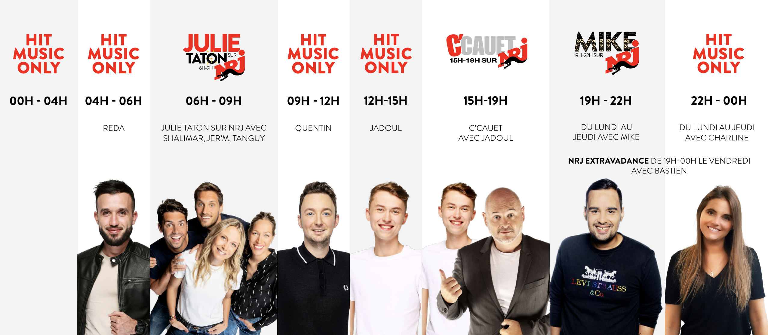 Pour la 3e saison, la matinale est confiée a Julie Taton, entourée de Shalimar, Jer’M et Tanguy. Cauet (et Jadoul depuis la Belgique), prennent le relais à 15h. Mike anime la tranche du soir, de 19h à 22h, du lundi au jeudi. Charline arrive à l'antenne de 22h à minuit, du lundi au jeudi. Et, le vendredi, Bastien prend le relais, de 19h à minuit avec NRJ Extravadance.