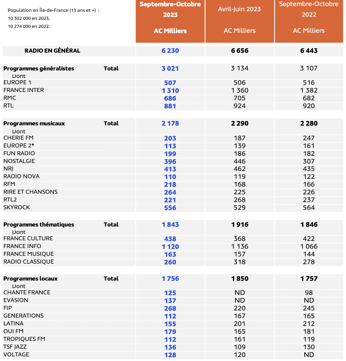 Médiamétrie - EAR > Île-de-France - Septembre-Octobre 2023 - Ensemble 13 ans et plus - Copyright Médiamétrie - Tous droits réservés