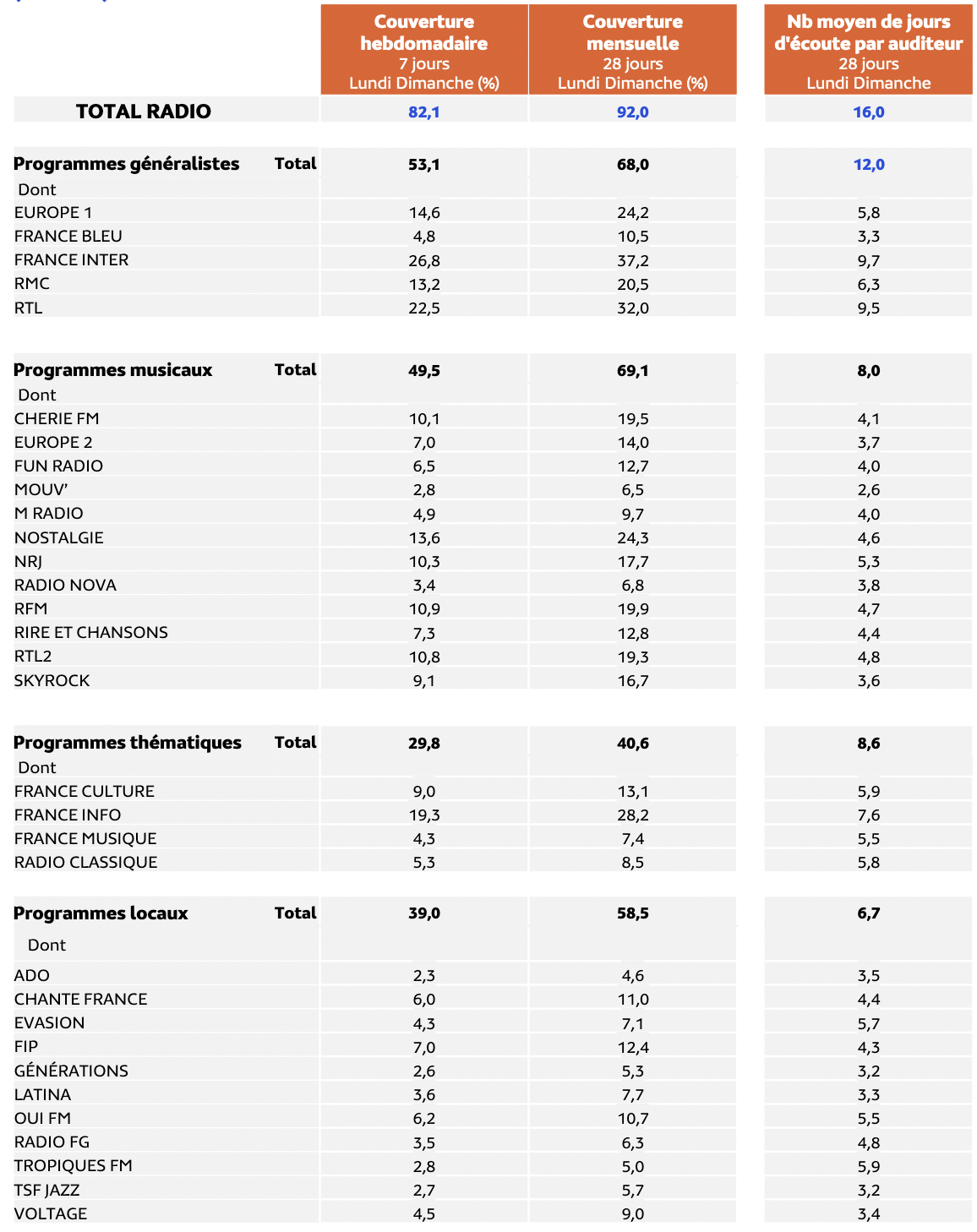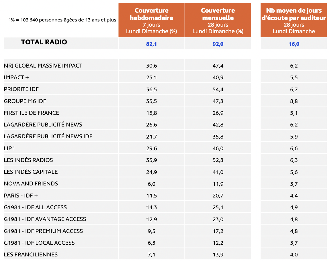 La couverture (en %) et nombre de jours d’écoute des stations. Médiamétrie - EAR > Insights Île-de-France 2023/2024 - Copyright Médiamétrie - Tous droits réservés