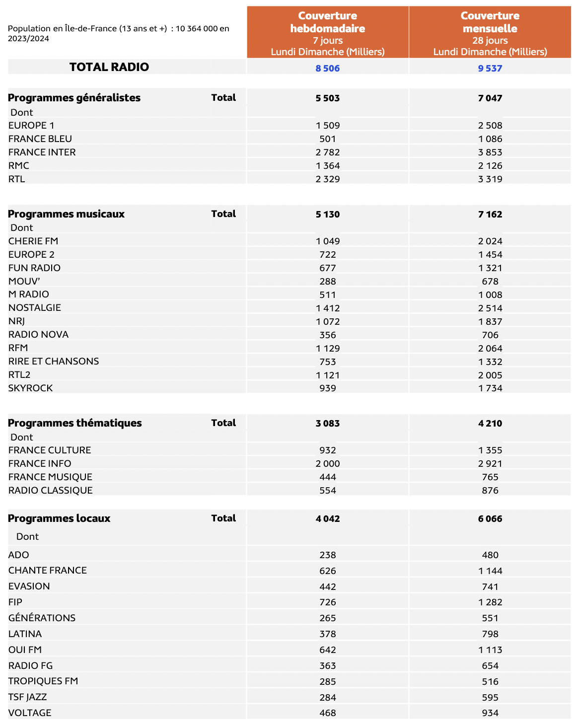 La couverture des stations en milliers. Médiamétrie - EAR > Insights Île-de-France 2023/2024 - Copyright Médiamétrie - Tous droits réservés