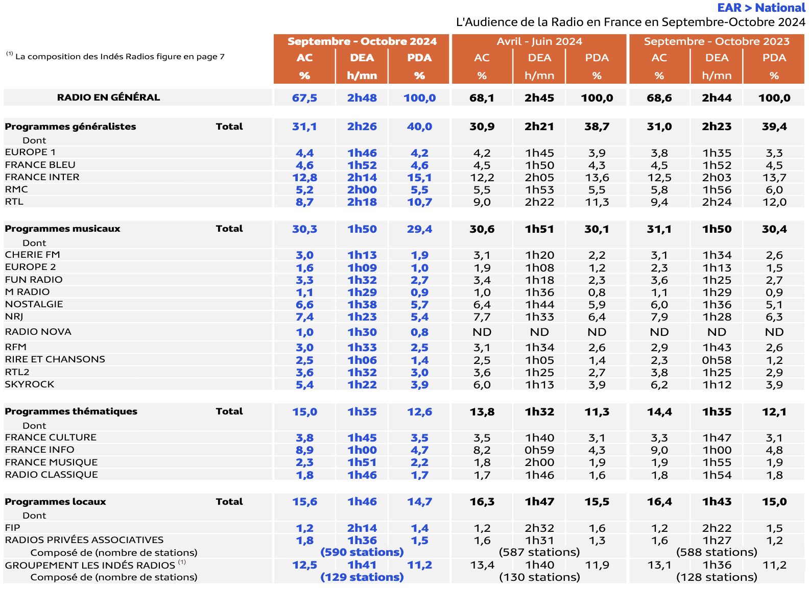 D'abord, vous pouvez trouver ICI les derniers résultats de l'EAR National pour la période d'avril à juin 2024. Chez les Généralistes, France Inter avait terminé la course en tête avec 12.2% d'audience cumulée. Chez les Musicales, NRJ avait signé le meilleur résultat avec 6.4%.
