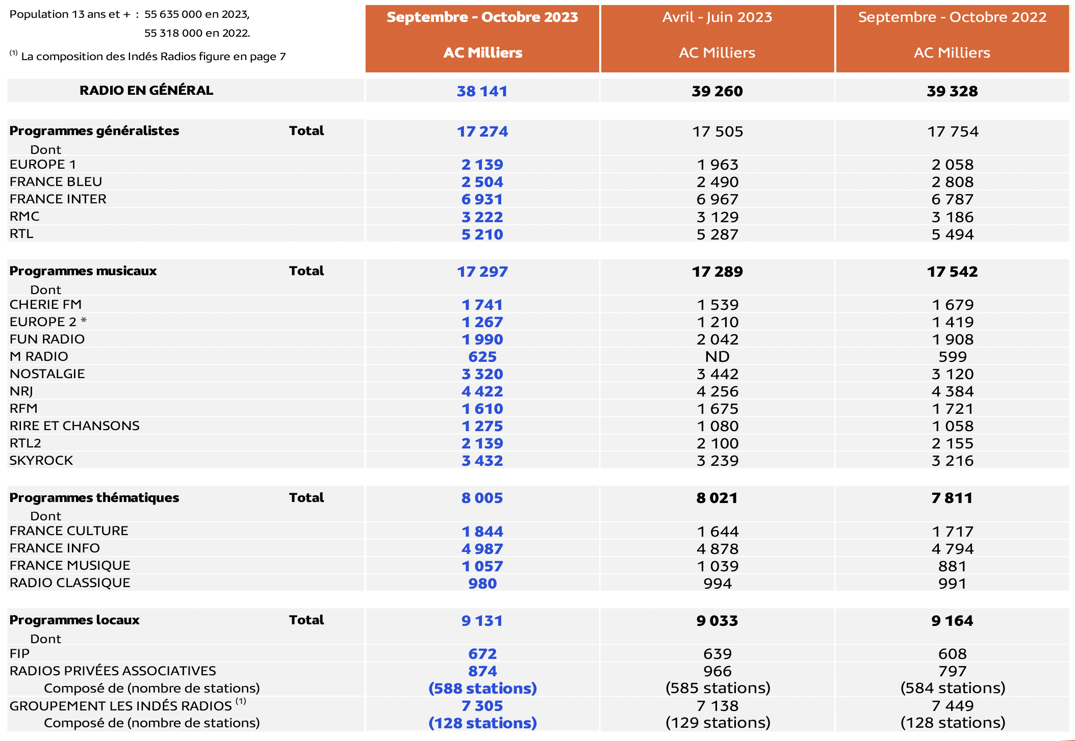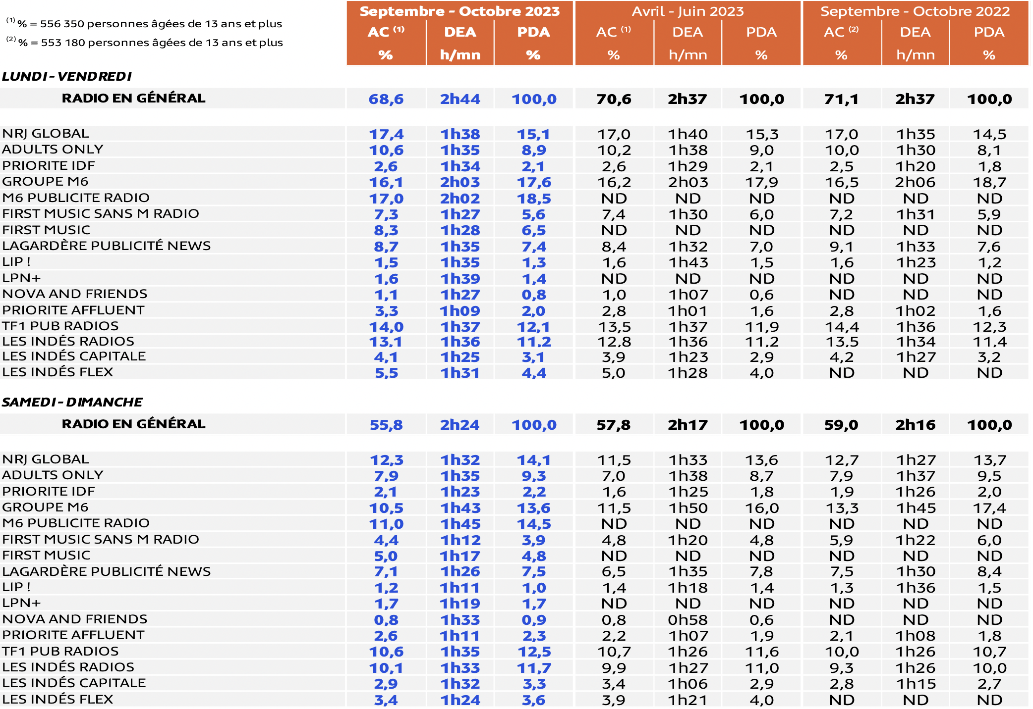 L’Audience de la Radio en Lundi-Vendredi (5h-24h) Communiqué de Presse EAR > National L'Audience de la Radio en France en Septembre - Octobre 2023 Médiamétrie - EAR > National – Septembre - Octobre 2023 - Ensemble 13 ans et plus - Copyright Médiamétrie - Tous droits réservés
