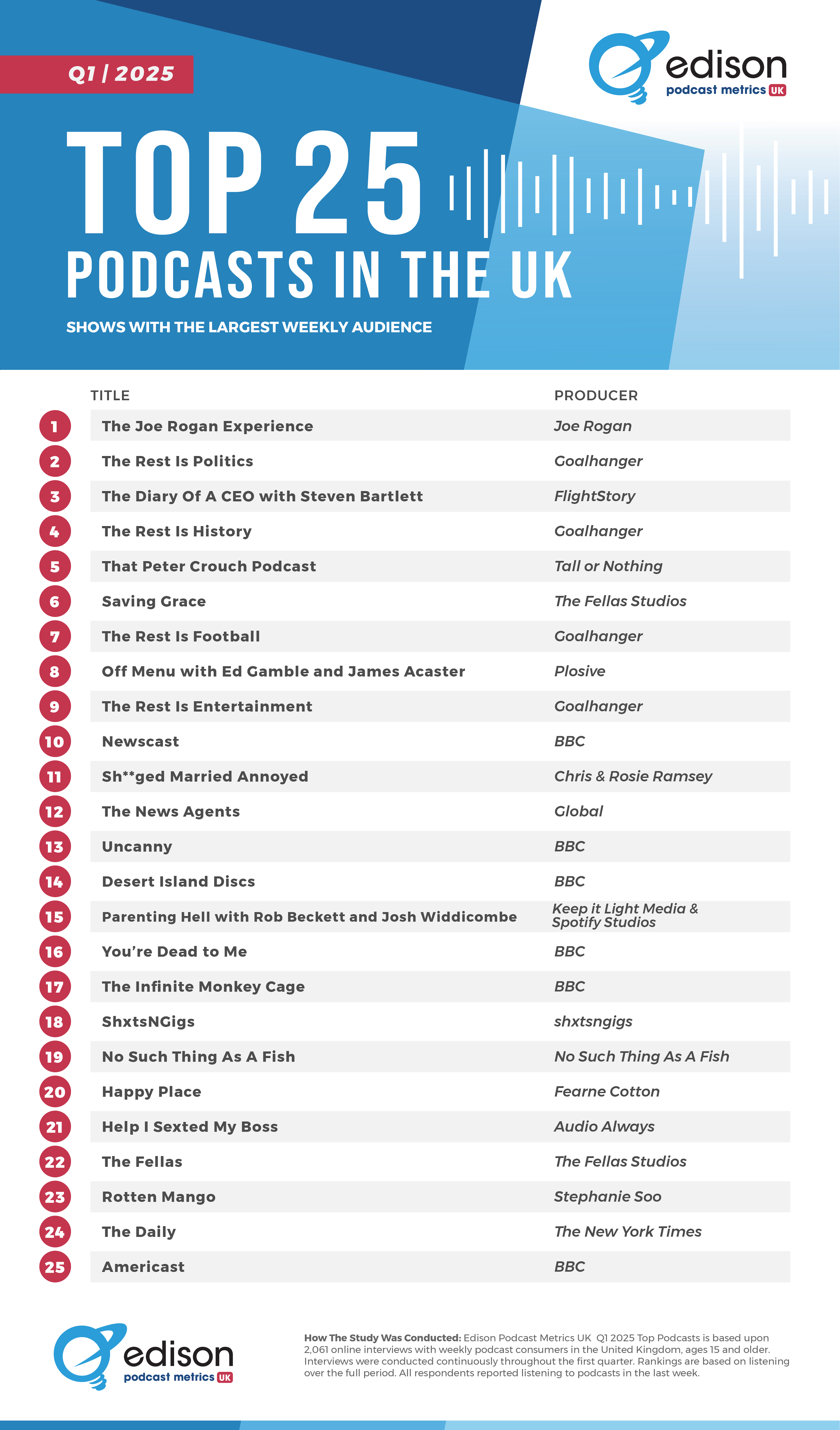 Edison Research a dévoilé le Top 25 des podcasts les plus écoutés au Royaume-Uni pour le premier trimestre 2025. "The Joe Rogan Experience" conserve la première place, suivi de "The Rest Is Politics" (Goalhanger) et de "The Diary Of A CEO with Steven Bartlett" (FlightStory). Ce trio de tête reste inchangé depuis la fin de l’année 2024, illustrant une fidélité notable des auditeurs britanniques. Derrière, "The Rest Is History" (Goalhanger) et "That Peter Crouch Podcast" (Tall or Nothing), tous deux en forte progression (+9 places chacun), s’imposent dans le haut du classement.