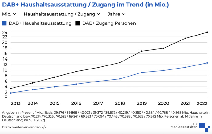 Chaque année, depuis 2013, Die medienanstalten collecte des données sur le développement de la radio numérique en Allemagne. Le nouveau "Rapport sur la numérisation audio" sert à l'industrie et à la politique en tant qu'indicateur fiable et indépendant du développement de la réception de la radio numérique. Le nouveau "Audio Trends 2022" montre que les médias innovent et que la numérisation de la radiodiffusion en Allemagne continue de croître.