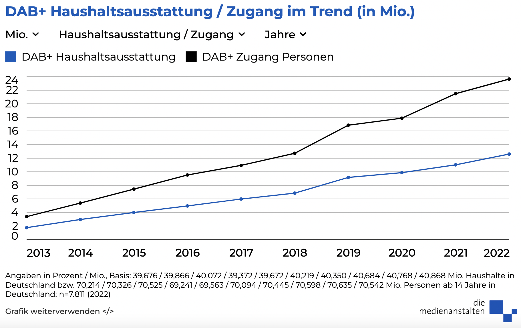 En seulement 10 ans, le nombre de foyers équipés de récepteurs DAB+ a été multiplié par 7. Aujourd'hui, 12.6 millions de foyers possèdent désormais au moins une radio DAB, ce qui correspond à près d'un tiers de tous les foyers en Allemagne. Le taux de croissance moyen sur les 10 dernières années est de 25% par an en moyenne. Le numérique devient de plus en plus la norme : la part des radios DAB+, IP ou hybrides a presque doublé au cours des cinq dernières années, passant de 11 à 21%. Par rapport à 2018, on compte aujourd'hui 12 millions de radios FM dans les foyers. Cela contraste avec une augmentation de 16 millions d'appareils numériques.