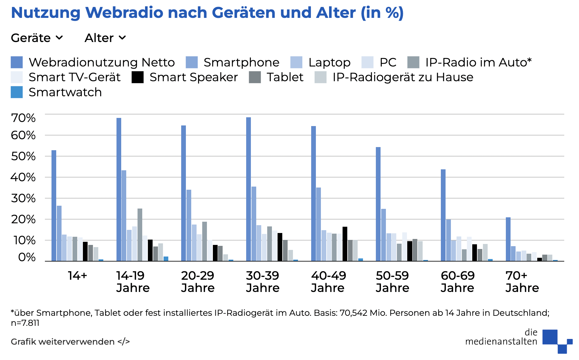 Enfin, plus de la moitié (53%) des personnes âgées de 14 ans et plus en Allemagne écoutent une webradio et 27% utilisent leur smartphone pour le faire. Le nombre de personnes utilisant un flux d'une webradio via une enceinte connectées a été multiplié au cours des cinq dernières années, passant de 2.8% en 2018 à plus de 9% en 2022.