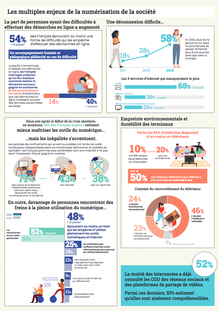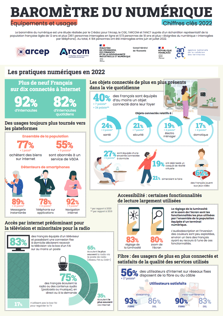 Piloté de manière conjointe par l’Arcom, l’Autorité de régulation des communications électroniques, des postes et de la distribution de la presse (Arcep), le Conseil Général de l’Economie (CGE) et l’Agence Nationale de la Cohésion des Territoires (ANCT), et réalisé avec le Credoc, ce Baromètre du numérique se positionne comme une étude de référence sur la diffusion des technologies de l’information et de la communication dans la société française.