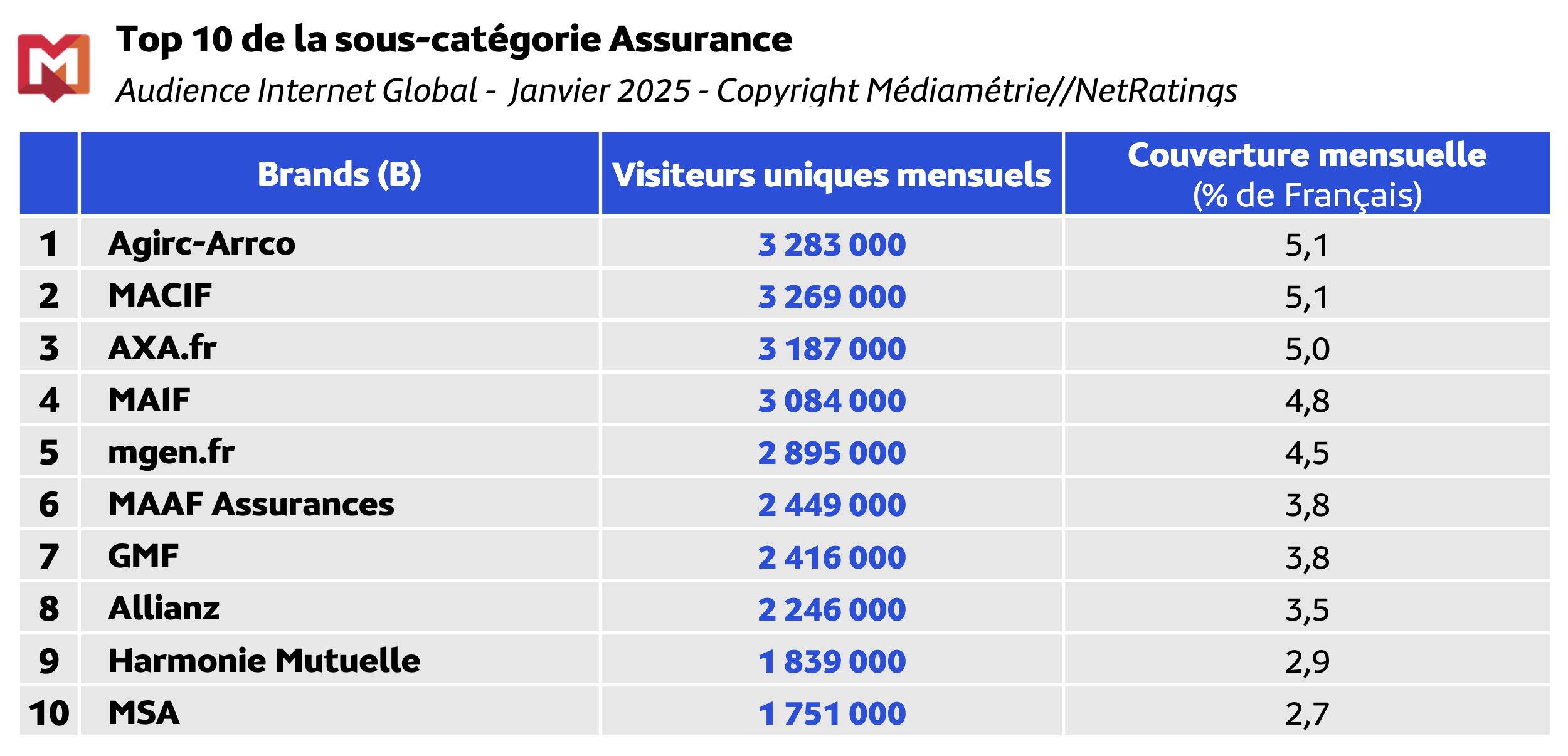 Au cours du mois, plus des trois quarts des visiteurs (75.5%) ont utilisé leur mobile pour consulter les sites et applications d’assurance (+ 5 points en un an). Cela correspond à 21.1 millions de Français, soit 3.5 millions de mobinautes supplémentaires par rapport à l’an dernier (+20%). Si les usages mobiles progressent au sein de cet univers, l’écran ordinateur continue toutefois de concentrer la majorité du temps passé sur la catégorie (56.2%). En janvier 2025, 56,4 millions d’individus se sont connectés à Internet au cours du mois, soit 88% des Français.