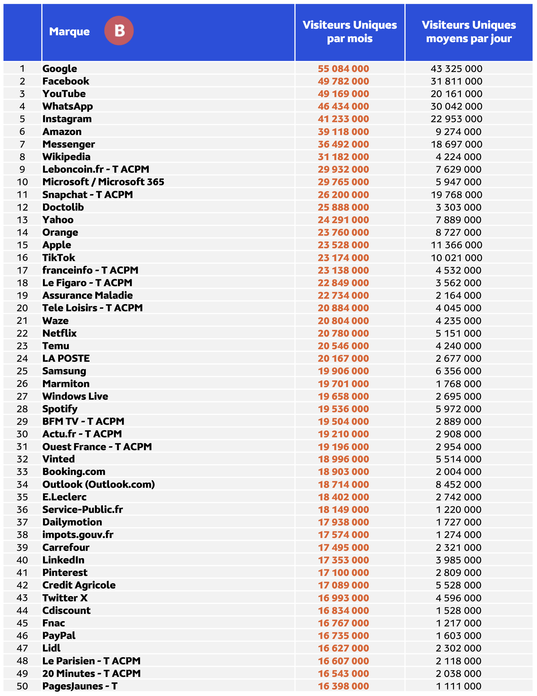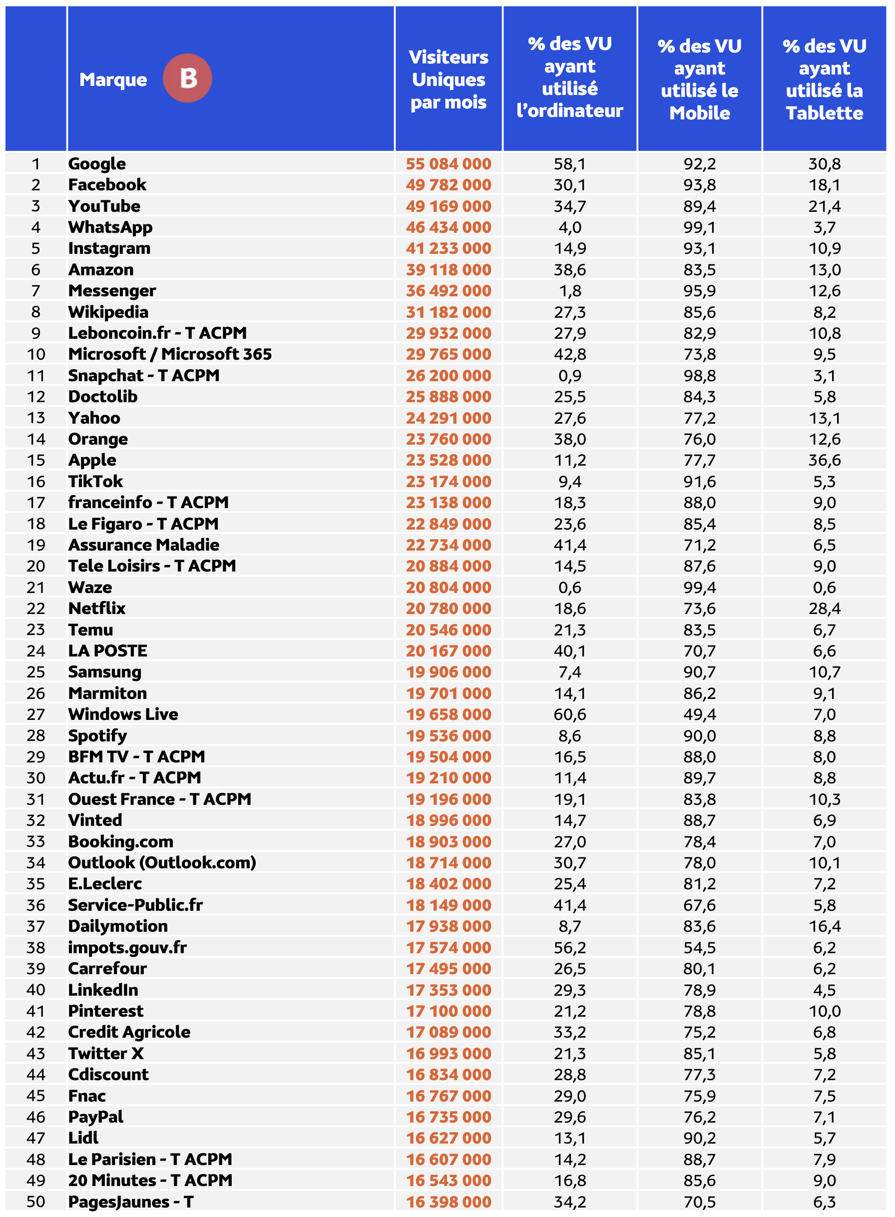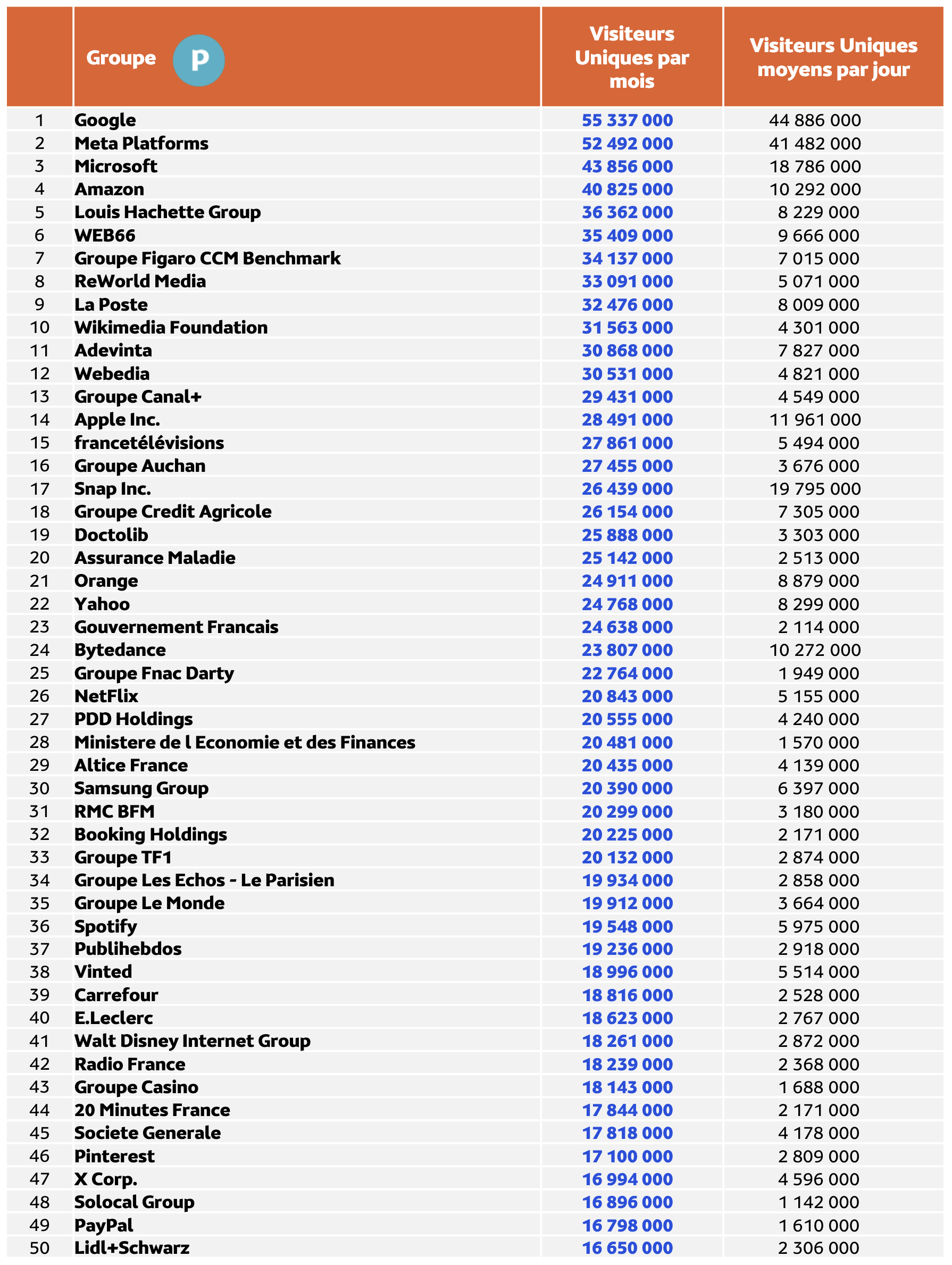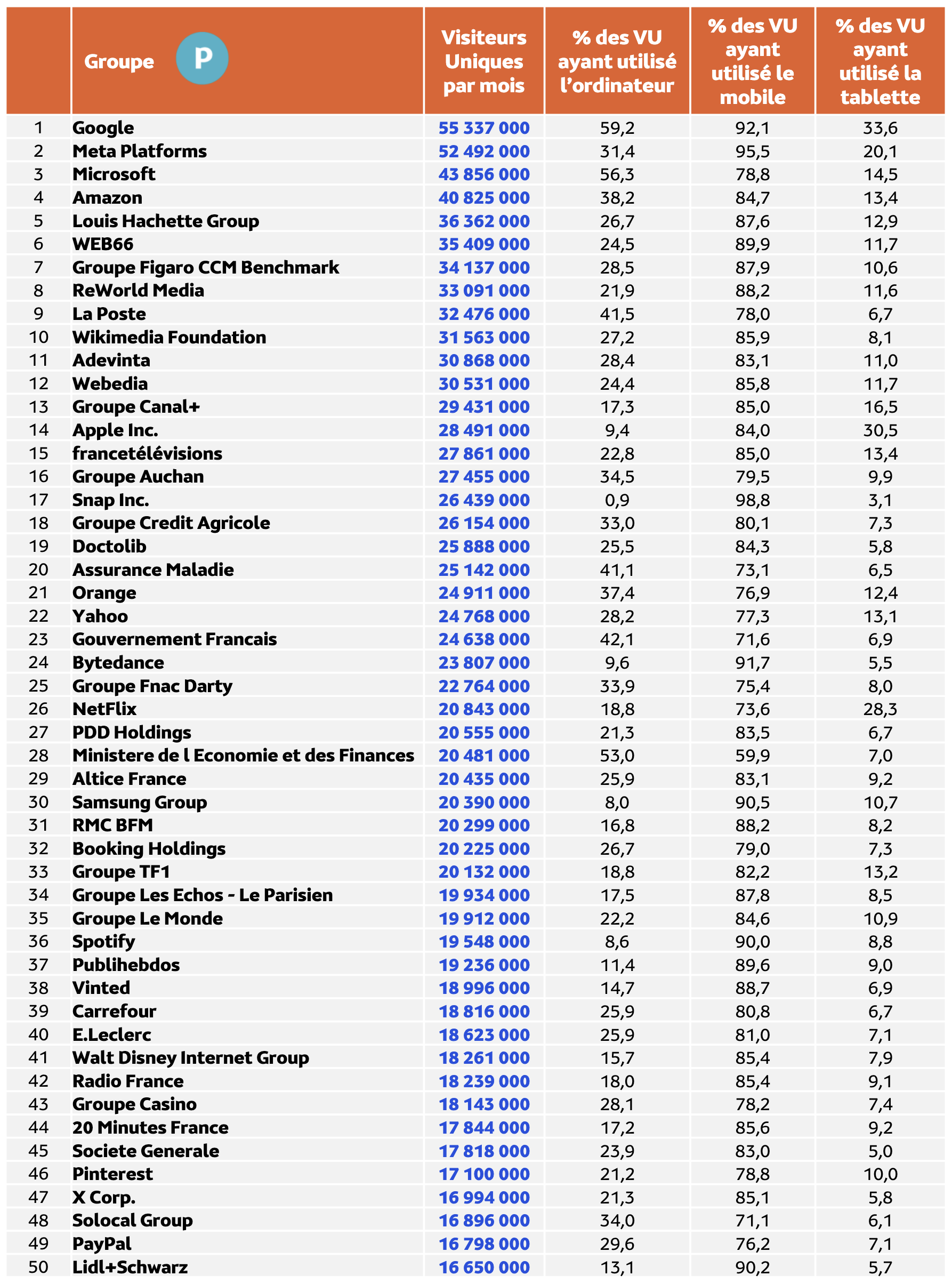 Médiamétrie et Médiamétrie//NetRatings - Audience Internet Global - Tous lieux de connexion - France - Janvier 2025 - Base : 2 ans et plus Copyright Médiamétrie - Tous droits réservés