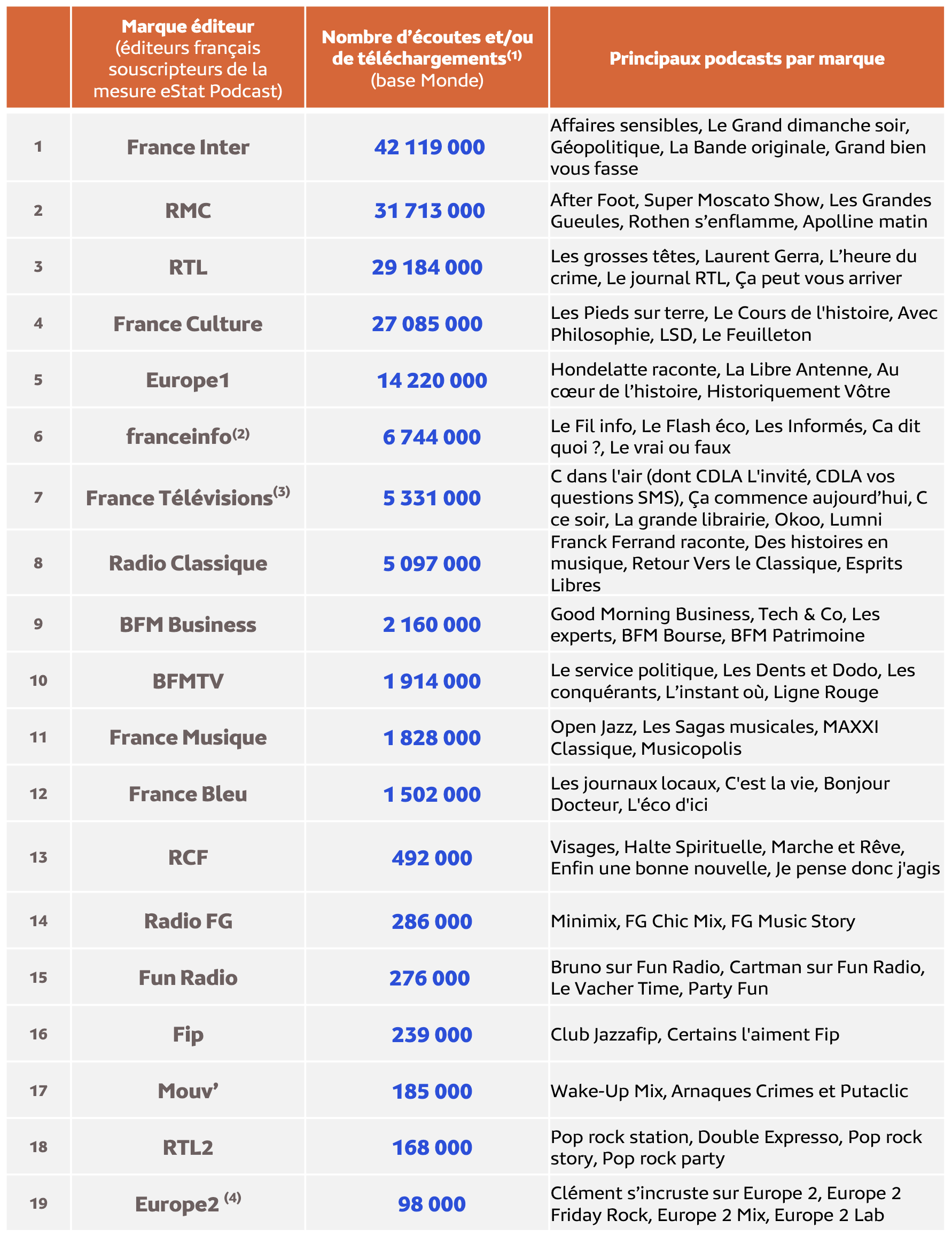 France Inter a été la radio la plus réécoutée en avril dernier avec 42 119 000 écoutes et/ou téléchargements en très légère baisse sur un mois avec 42 879 000 en mars dernier. Suivent RMC (31 173 000), RTL (29 184 000), France Culture (27 085 000) et Europe 1 (14 220 000). Le Top 5 reste donc inchangé d'un mois à l'autre. Radio France place 3 de ses 7 stations dans le Top 10 : France Inter, France Culture et franceinfo (6 744 000).