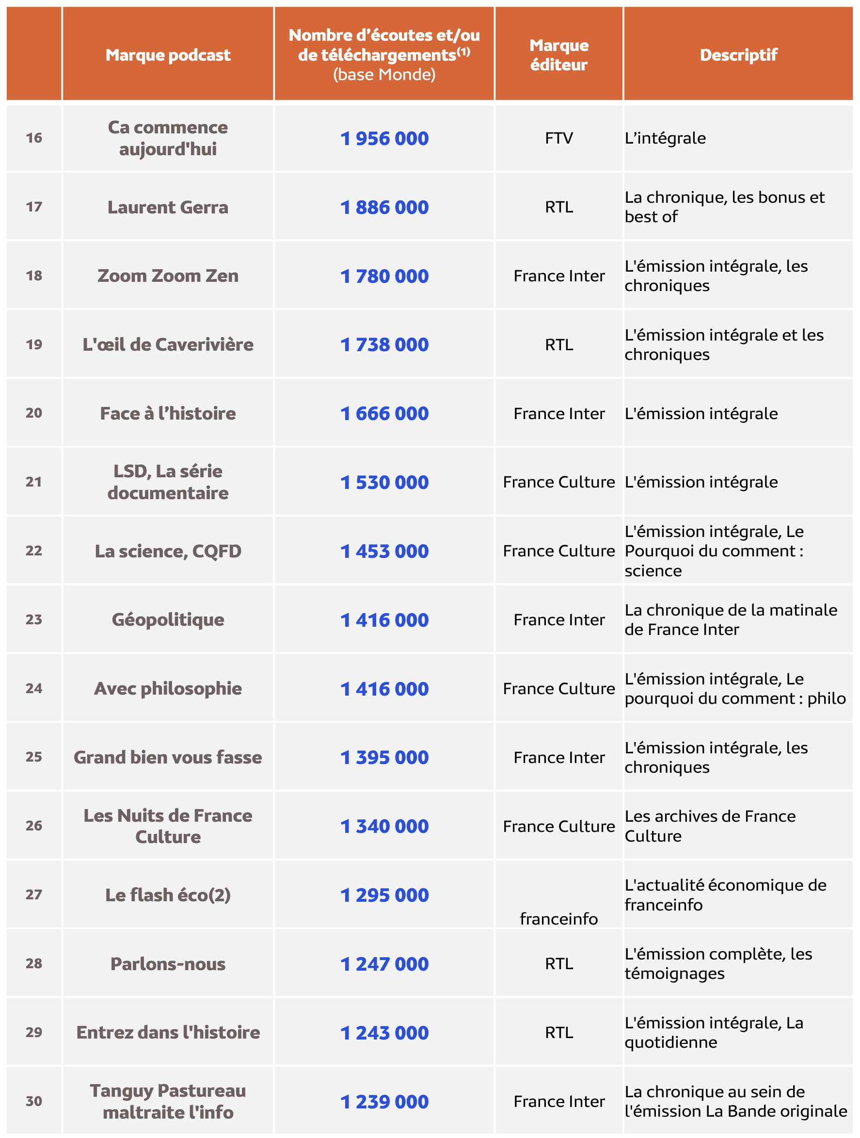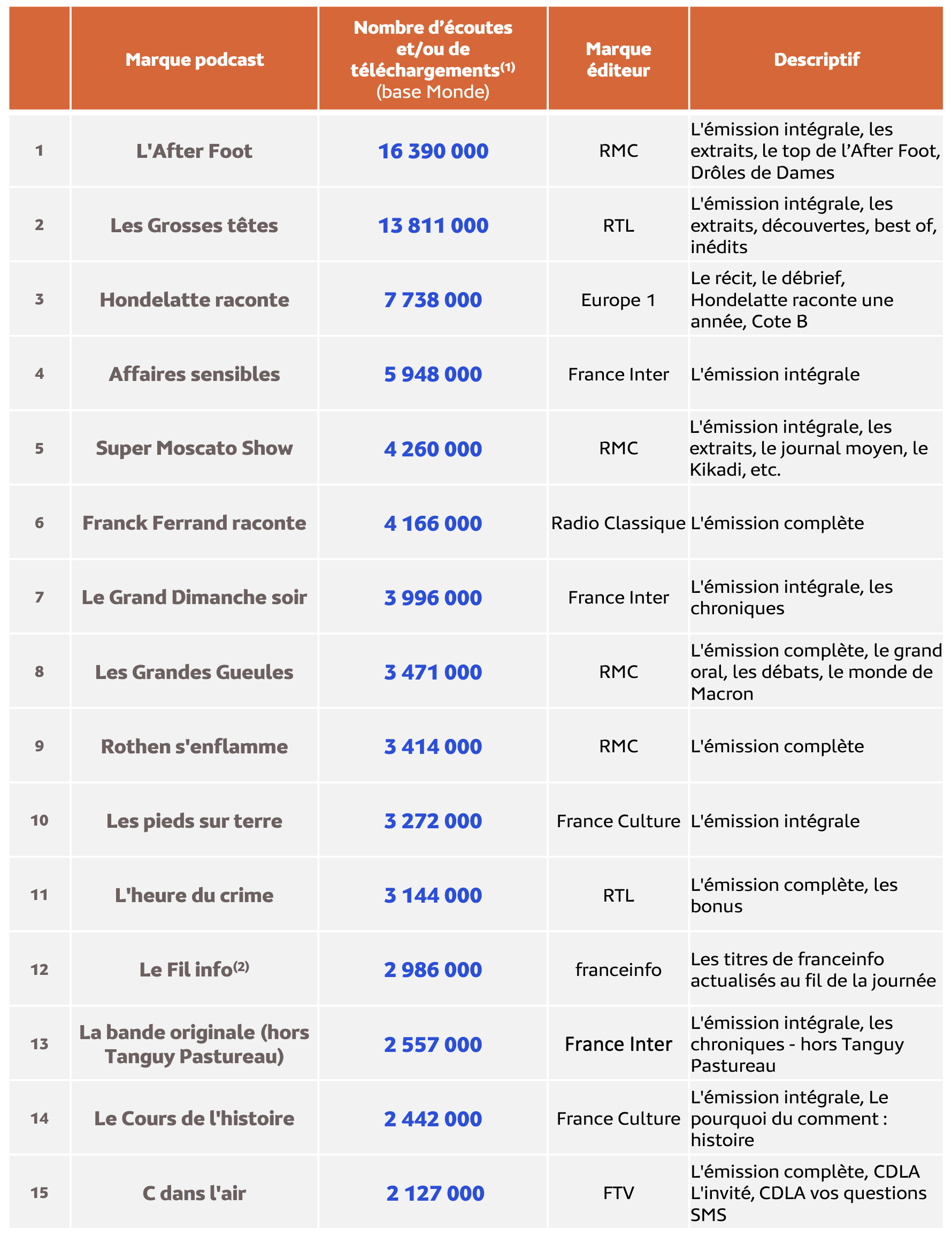 En avril, l'émission "L'After Foot" reprend la tête du classement avec 16 390 000 écoutes et/ou téléchargements. L'émission "Les Grosses têtes" perd la première place avec 13 811 000 écoutes et/ou téléchargements contre 14 392 000 en mars dernier...