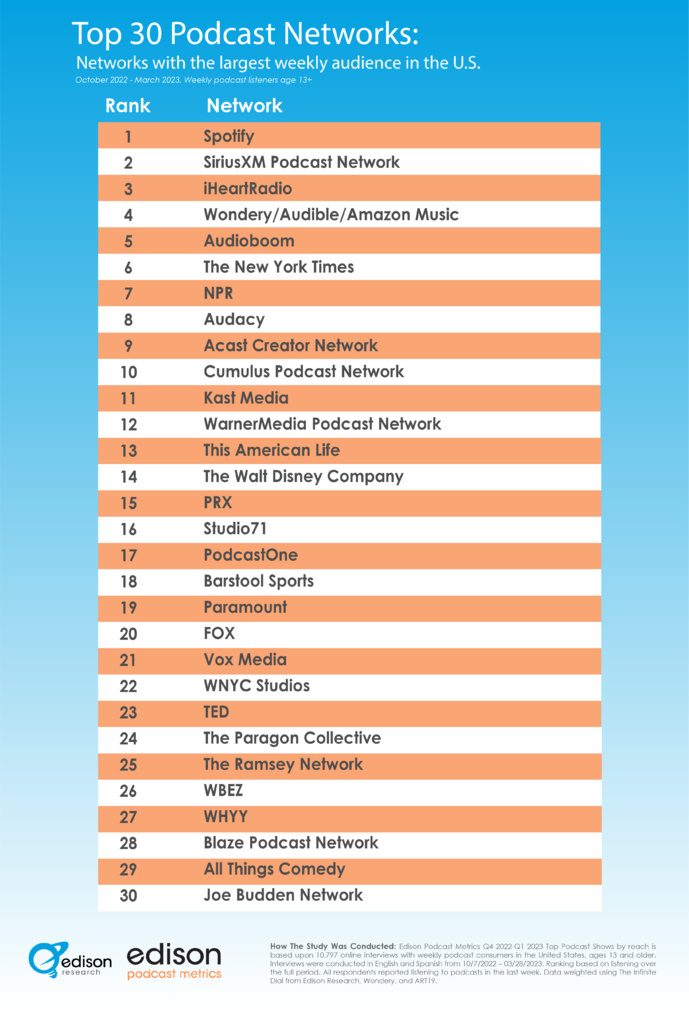 Spotify, SiriusXM Podcast Network et iHeartRadio occupent respectivement les trois premières places. Spotify et SiriusXM ont tour à tour occupé la première place du classement au cours de la dernière année. La liste classe les réseaux de podcasts en fonction de la portée totale de l'audience calculée par Edison Podcast Metrics.