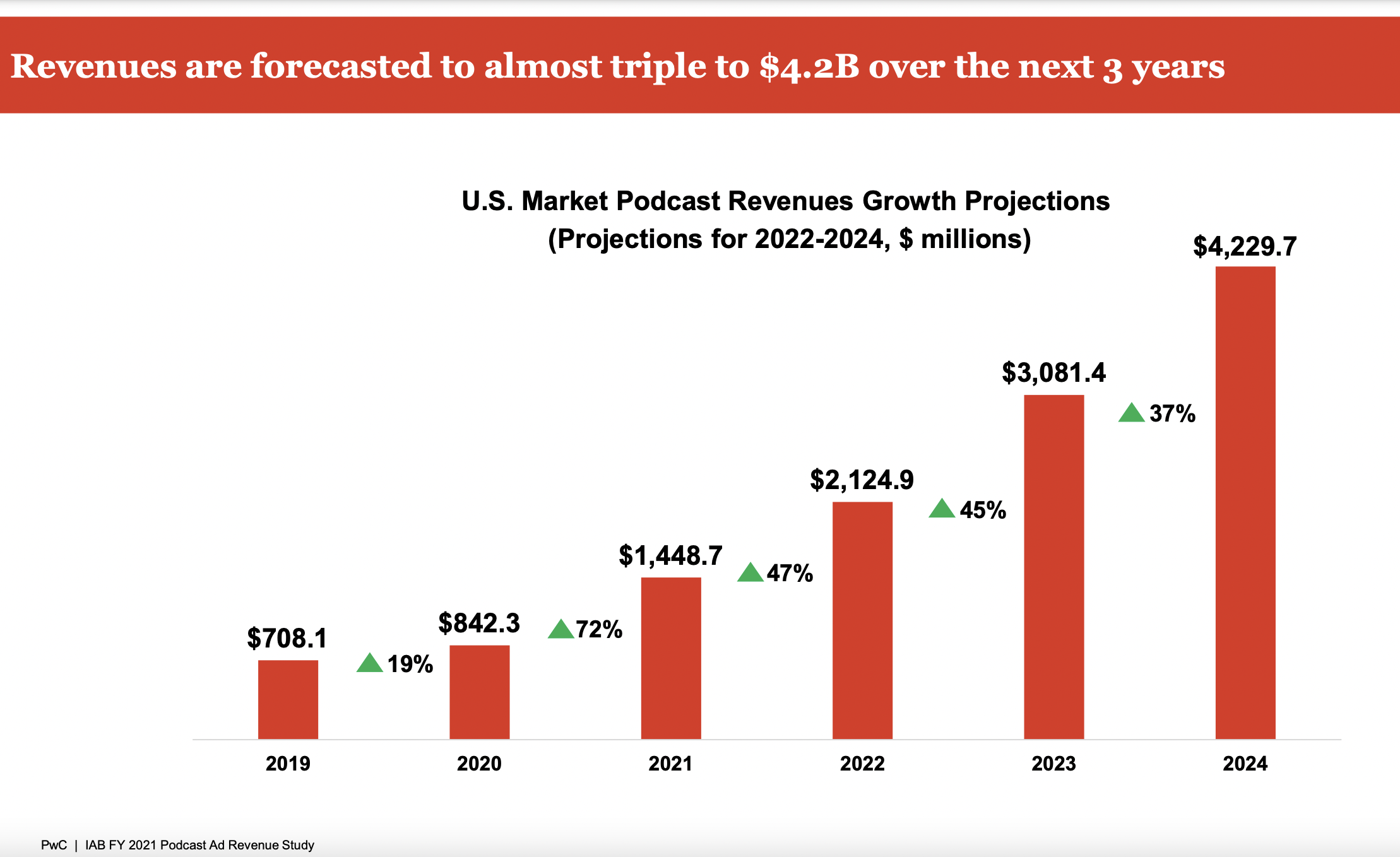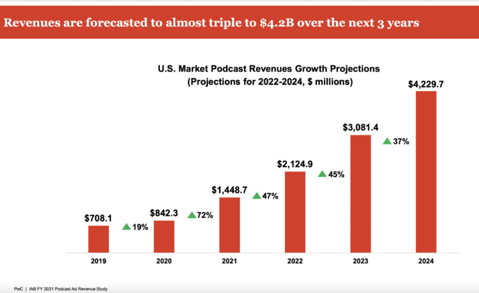 Cette sixième étude annuelle de l'IAB sur les revenus publicitaires des podcasts aux États-Unis, préparée pour l'IAB par PricewaterhouseCoopers LLP ("PwC"), quantifie les revenus publicitaires annuels des podcasts générés au cours de l'année écoulée, décrit les principales tendances des podcasts et prévoit les revenus futurs jusqu'en 2024. Les revenus continuent de croître plus rapidement que le marché total des revenus publicitaires sur Internet - en hausse de 72% en glissement annuel contre 35%. Les catégories publicitaires de podcasts se diversifient : la catégorie "Autre" - qui contient un nombre croissant de catégories d'annonces avec des dépenses moindres - a plus que triplé en seulement deux ans. Alors que la demande des annonceurs augmentait, la publicité pré-roll a augmenté sa part de revenus à 32% contre 22% en 2020.
