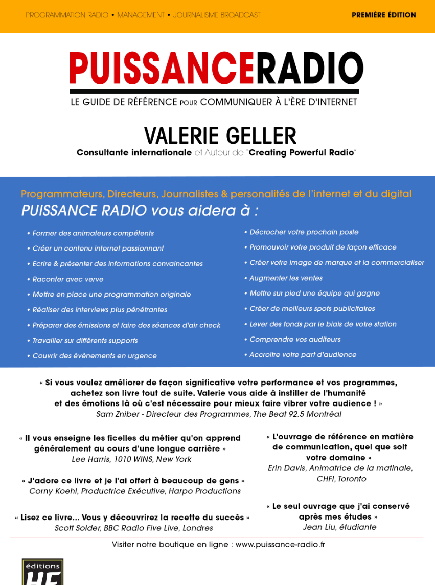 Vous trouverez beaucoup d’étude de cas, d’exemples concrets applicables très facilement, glanés par Valerie au fil de ses missions de consulting à travers 500 radios et 35 pays dans le monde. Elle interroge les plus grands patrons de radio, les meilleurs présentateurs qui dévoilent leurs secrets ; toujours avec un optimisme très anglo-saxon. Bref, Valerie a su appliquer ses propres conseils au fil des 500 pages de son ouvrage : ne jamais être ennuyeux, être percutant, dire la vérité et oser être formidable !