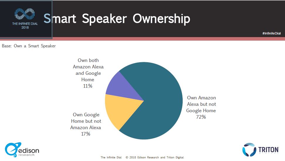 La radio de papa est est-elle entrain de rendre son dernier souffle ? Si le taux d’équipement du bon vieux transistor ou de l’autoradio FM est encore très élevé en France, sans compter les retards de lancement du DAB+, la bascule technologique est entrain de se réaliser outre-Atlantique, selon l’étude "The Infinite Dial 2018" sur les modes de consommation des médias sur le digital aux États-Unis. Si la détention des smartphones stagne à plus de 80 %, preuve d’une certaine maturité du marché, les assistants vocaux commencent à prendre une véritable place dans les foyers américains. Le taux d’équipement des Google Home ou Amazon Echo (Alexa) a été multiplié par deux en un an. L’étude montre même que les foyers s’équipent de plusieurs assistants vocaux : 33 % d’entre eux en possèdent même plus de 2.