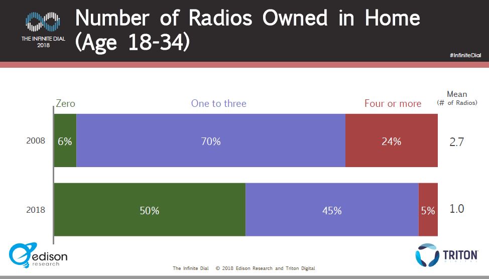 A contrario, le nombre de postes de radio chute. Ainsi, l’étude constate qu’en 10 ans (2008 vs 2018), la part des foyers n’ayant aucun poste de radio est passé de 4 % à 29 % ! Pire, chez les 18-34 ans, la part grimpe à 50 % au lieu de 6 % il y a 10 ans.