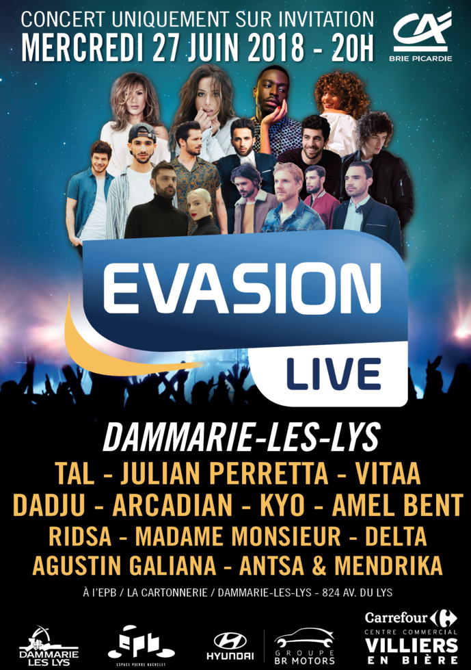 Pour la 4e année consécutive, la radio Évasion organise son concert gratuit "Évasion Live" avec la municipalité de Dammarie-les-Lys. 4 000 personnes sont attendus pour cet événement gratuit uniquement sur invitation. À partir de 16h, Évasion sera en direct des loges jusqu’à 20h pour interviewer les artistes qui seront réunis sur scène : Tal, Amel Bent, Vitaa, Dadju, Kyo, Arcadian, Julian Perretta, Madame Moinsieur, Ridsa, Delta, Antsa & Mendrika et Augustin Galiana