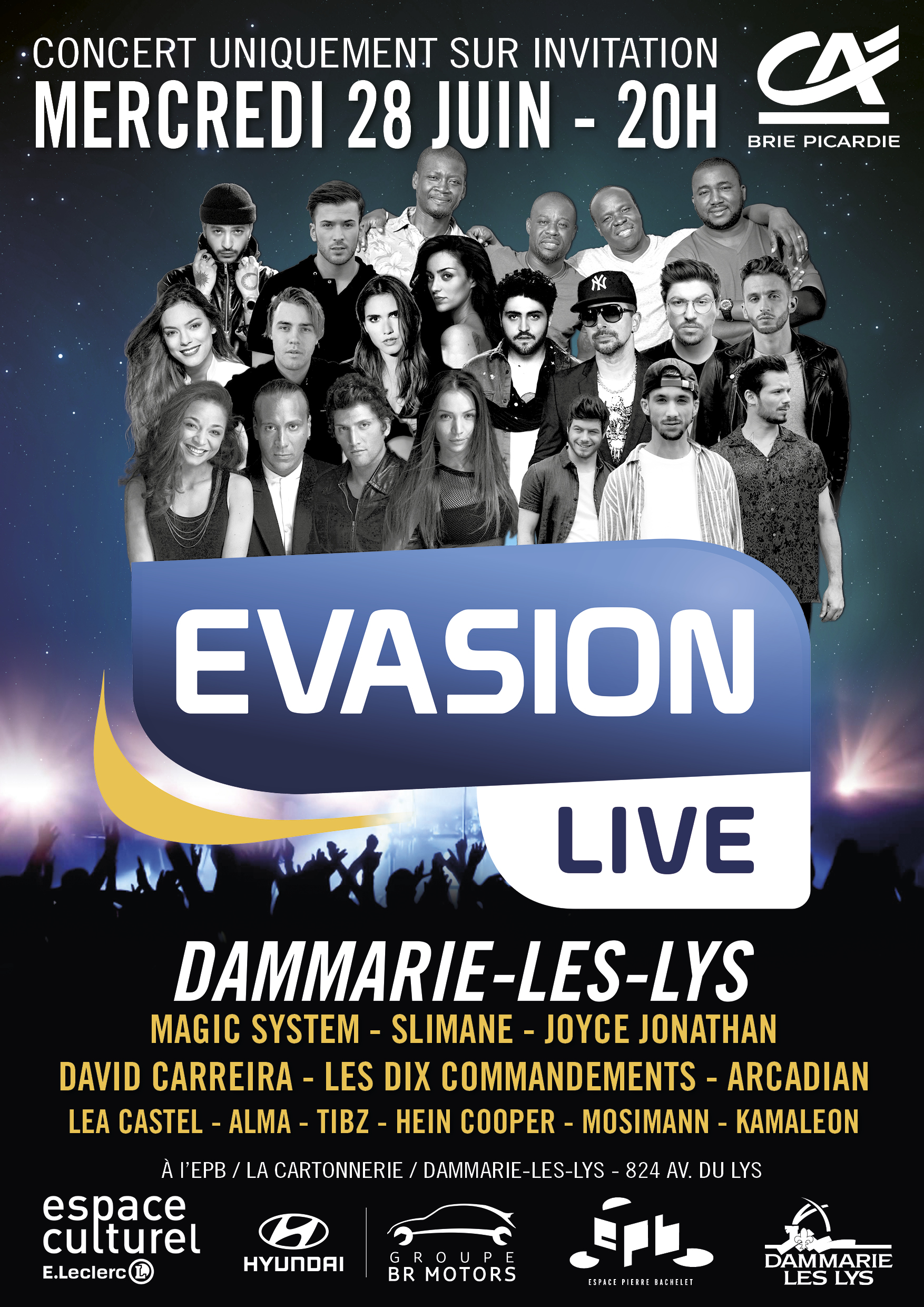 Pour la troisième année consécutive, Évasion organise son concert gratuit "Évasion live" avec la marie de Dammarie-les-Lys. 4 000 personnes sont attendues pour cet événement gratuit uniquement sur invitation. À partir de 16h, Évasion sera en direct des loges jusqu’à 20h pour interviewer les artistes présents sur scène : Magic System, Slimane, Joyce Jonathan, David Carreira, Les dix Commandements, Arcadian, Tibz, Hein Cooper, Kamaleon, Léa Castel et Mosimann. Un Warm up DJ en pré-show avec Eleganz Music chauffera le public avant le début du concert à 20h30.