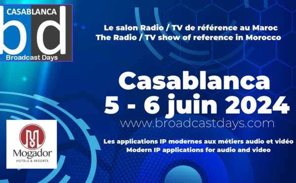 Les Casablanca Broadcast Days se tiendront les 5 et 6 juin 2024 au Grand Mogador à Casablanca. Le salon, désormais complet, accueille plus de 40 marques de l'audiovisuel ainsi qu'un programme de conférences et d'ateliers. Thème de cette année : "les applications IP modernes aux métiers audio et vidéo". La Lettre Pro de la Radio est partenaire officiel de ce salon et vous propose de découvrir le programme complet...