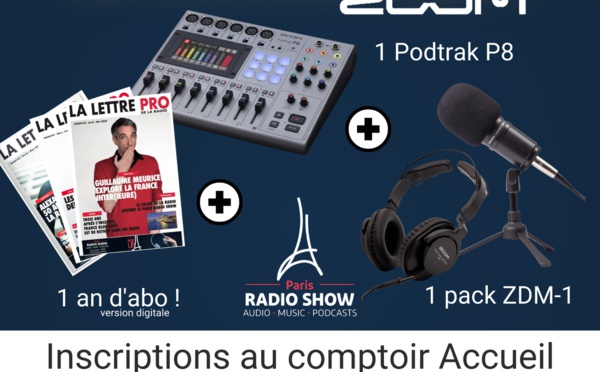 Parmi les très nombreuses animations proposées ce jeudi et ce vendredi dans le cadre du Paris Radio Show, voilà une dotation qui retiendra toute votre attention : un an d'abonnement au mensuel La Lettre Pro de la Radio, une console Podtrak P8 et un pack ZDM-1. Une dotation de plus de 700 euros.