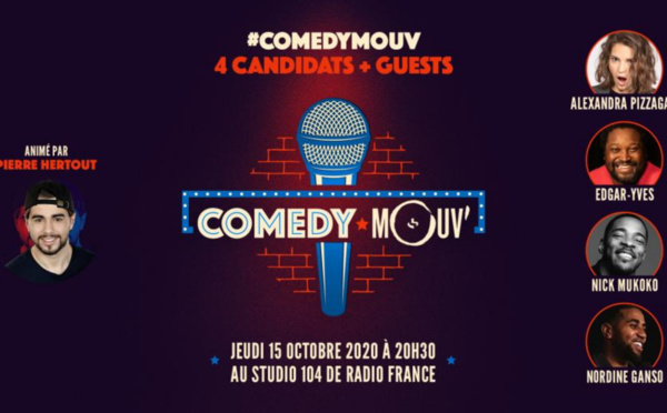 Présentée par Pierre Hertout, cette soirée Comedy Mouv’ veut détecter et mettre en avant les nouveaux talents de l’humour. Pour la 6e fois, les humoristes sélectionnés par Mouv' seront sur scène pour une soirée inédite, ce jeudi 15 octobre au Studio 104 de la Maison de la radio.