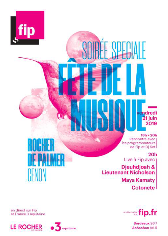 De 18h à 20h, rencontre et DJ sets avec les programmateurs de FIP puis, à partir de 20h, le groupe Djeuhdjoah & Lieutenant Nicholson ouvrira le Live à FIP et fera naviguer la chanson française entre jazz, afrobeat, soul, funk, électro et reggae. Il sera suivi du concert de Maya Kamaty qui jouera une musique métissée entre folk et maloya, puis place au groupe funk Cotonete qui offrira le son vintage de leur groove.