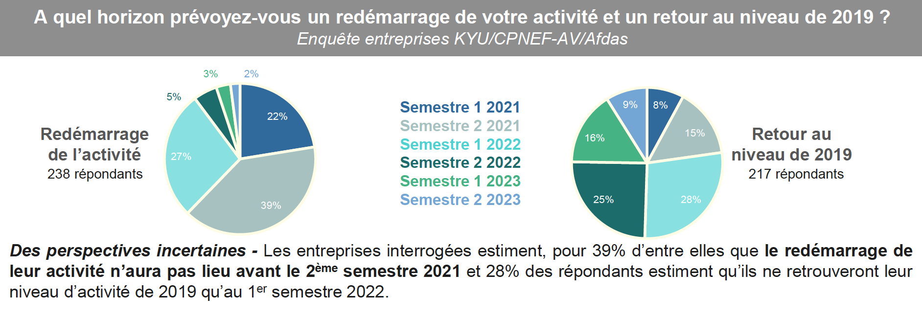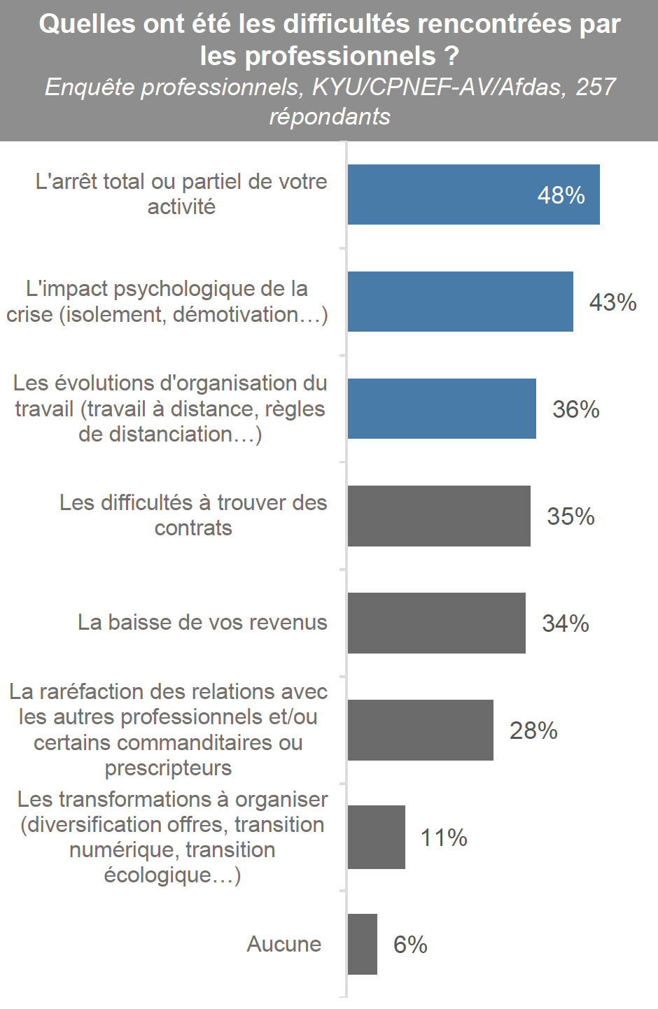 Dans le secteur de la radiodiffusion, plus de la moitié (52%) des entreprises de ce secteur ont déclaré une baisse de chiffre d’affaires. L’annulation des évènements locaux et des ateliers radio ainsi que la baisse des revenus publicitaires et de certaines aides départementales ou régionales sont particulièrement citées par les entreprises. La majorité des entreprises du champ de l'audiovisuel ont gardé un effectif salarié stable. Une réalité qui cache cependant une disparité entre les secteurs de l'audiovisuel. En effet, 30% des entreprises de la production audiovisuelle et cinéma ont connu une baisse de leurs effectifs salariés, contre 7% des entreprises de la radiodiffusion. Par ailleurs, on observe des baisses d’effectif par contrat de travail moins importantes que dans d’autres branches, car les équipes ont pu être maintenues tout au long de l’année...