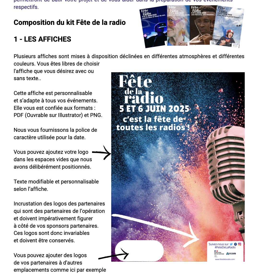 Le kit comprend plusieurs affiches en formats PDF (pour modification via Illustrator) et PNG. Ces affiches s’adaptent à tous types d’événements : portes ouvertes, émissions spéciales, concerts, rencontres auditeurs, animations digitales, etc.