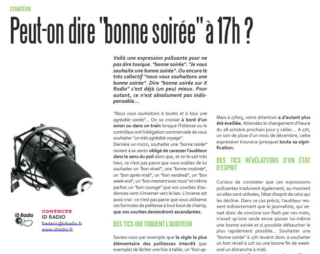 Derrière un micro, souhaiter une "bonne soirée" revient à se sentir obligé de caresser l’auditeur dans le sens du poil alors que, et on le sait très bien, ce n’est pas parce que vous oubliez de lui souhaiter un "bon réveil", une "bonne matinée", un "bon après-midi", un "bon vendredi", un "bon week-end", un "bon moment avec nous" et même parfois un "bon courage" que vos courbes d’audiences vont s’inverser vers le bas. L’inverse est aussi vrai : ce n’est pas parce que vous utiliserez ces formules de politesse à tout bout de champ, que vos courbes deviendront ascendantes.